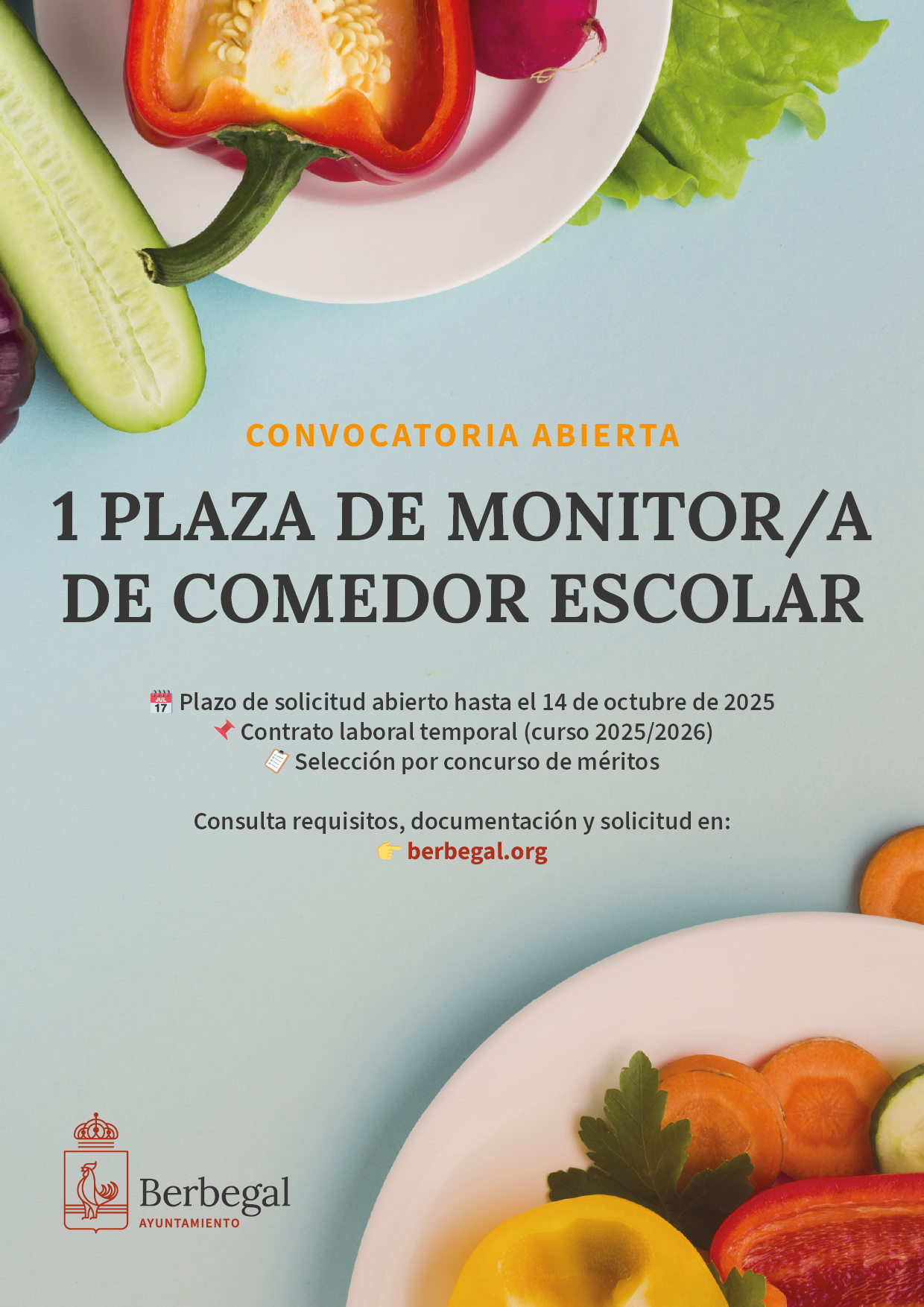 El Ayuntamiento de Berbegal ha aprobado la convocatoria para cubrir, mediante concurso de méritos, una plaza de monitor/a de comedor escolar, como personal laboral temporal a tiempo parcial, durante el curso 2025/2026.Características del puesto