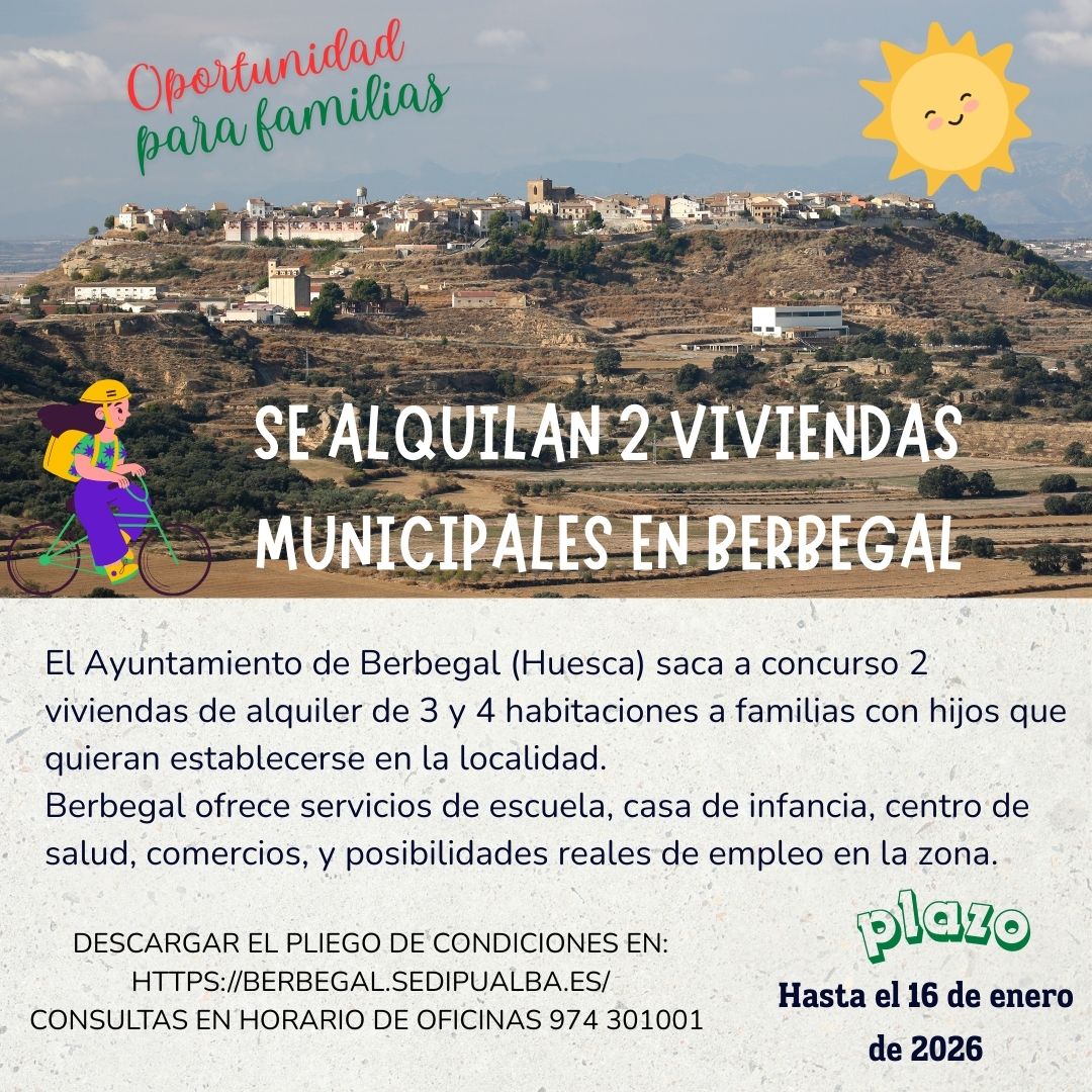 El Ayuntamiento de Berbegal (Huesca) ha abierto el plazo para el alquiler de dos viviendas municipales, destinadas a familias con hijos e hijas que deseen establecer su residencia en la localidad.