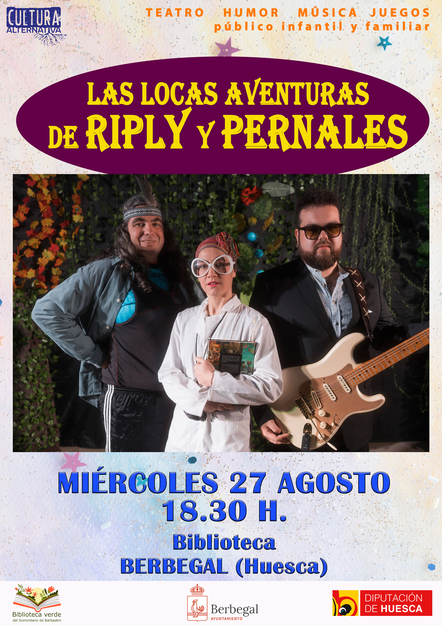 La Biblioteca de Berbegal propone una cita muy especial para cerrar el mes de agosto con alegría y risas. El miércoles 27 de agosto a las 18:30 h, acogerá el espectáculo “Las locas aventuras de Riply y Pernales”, una propuesta escénica que mezcla teatro, música en directo, humor y participación para el público infantil y familiar.