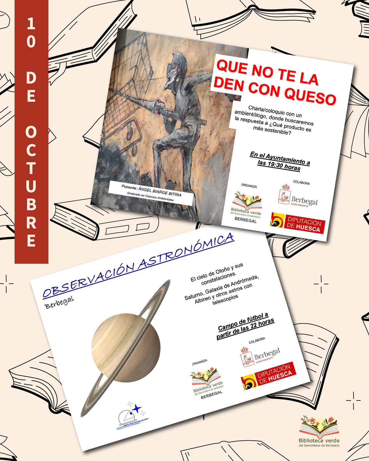 La Biblioteca de Berbegal organiza este viernes, 10 de octubre, dos actividades culturales y divulgativas abiertas a todos los públicos. Ambas son gratuitas y cuentan con la colaboración del Ayuntamiento de Berbegal y la Diputación Provincial de Huesca.Que no te la den con queso
