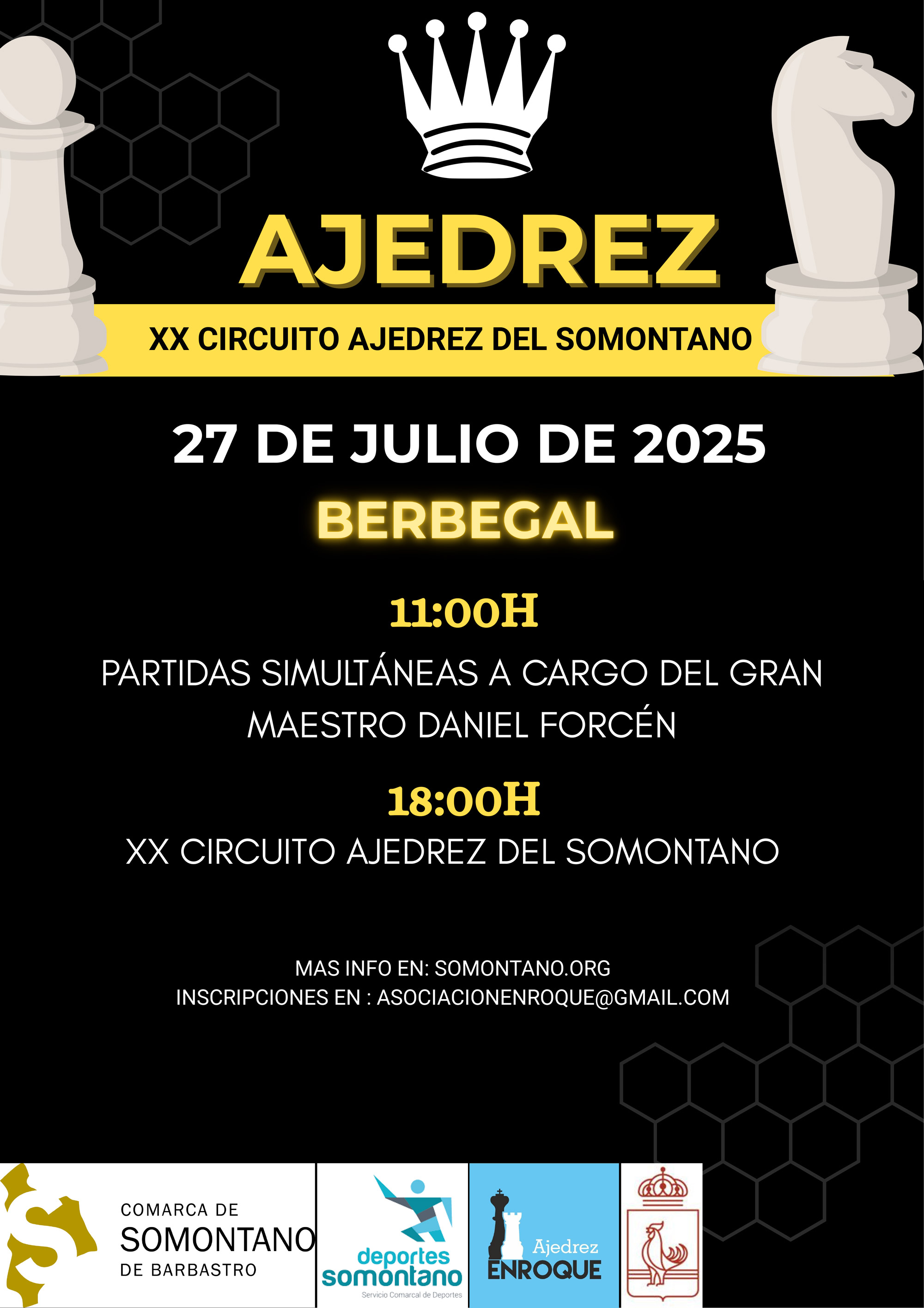 El Circuito de Ajedrez del Somontano, el torneo itinerante más longevo de Aragón, celebra este año su 20ª edición y vuelve a hacer escala en Berbegal. Este tradicional circuito recorre tres localidades de la comarca —Azara, Berbegal y Lagunarrota— con el objetivo de fomentar la práctica del ajedrez en el territorio.