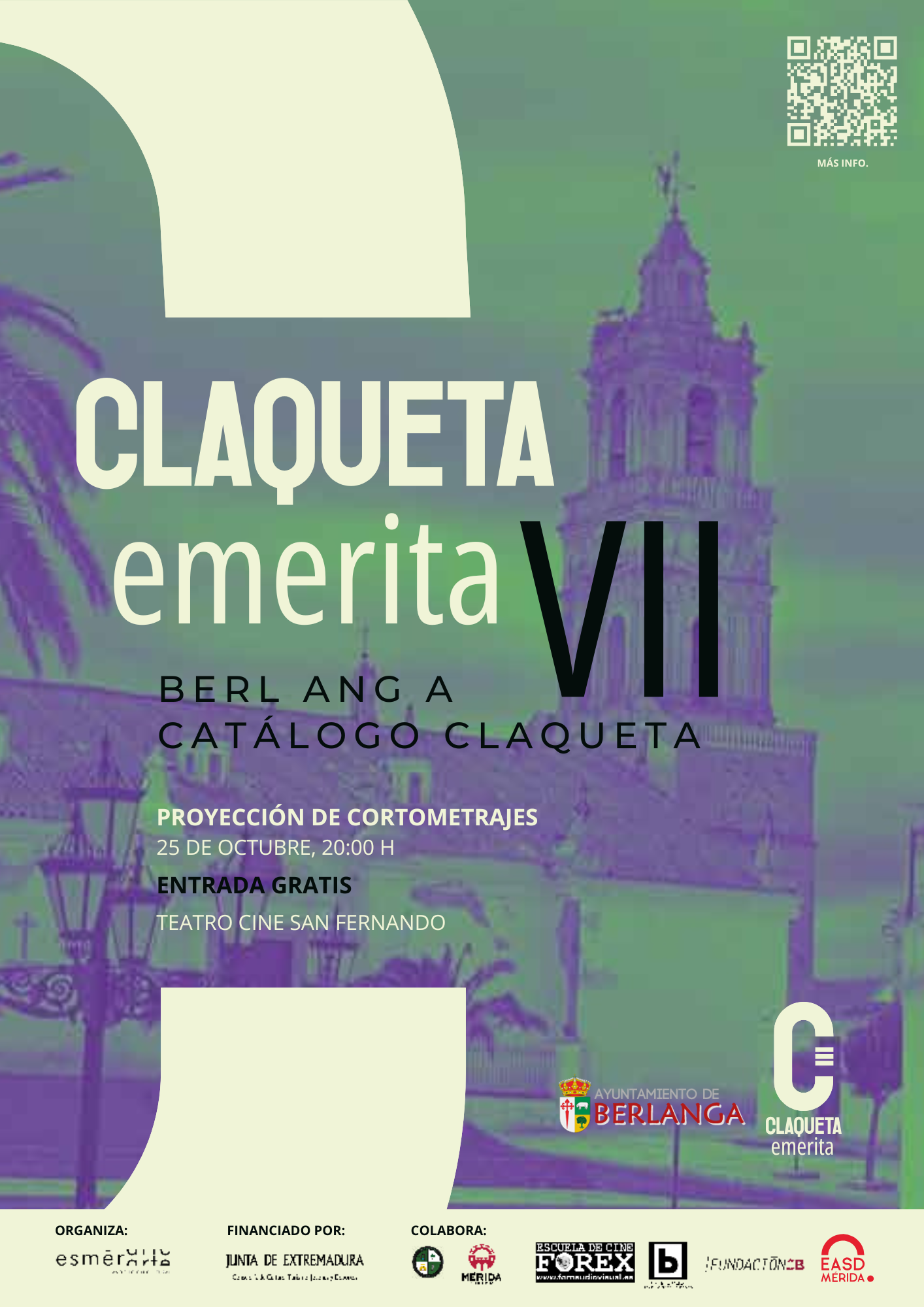 PROYECCIÓN CORTOMETRAJES CLAQUETA EMERITA2024-10-21 08:51:37CulturaClaqueta Emérita nació en 2018 como un festival que combina los proyectos audiovisuales con la danza, la música y otras artes escénicas y que tiene como eje vertebrador, la celebración de un concurso de cortometrajes que se materializa en una gala de entrega de premios a los mejores productos presentados.