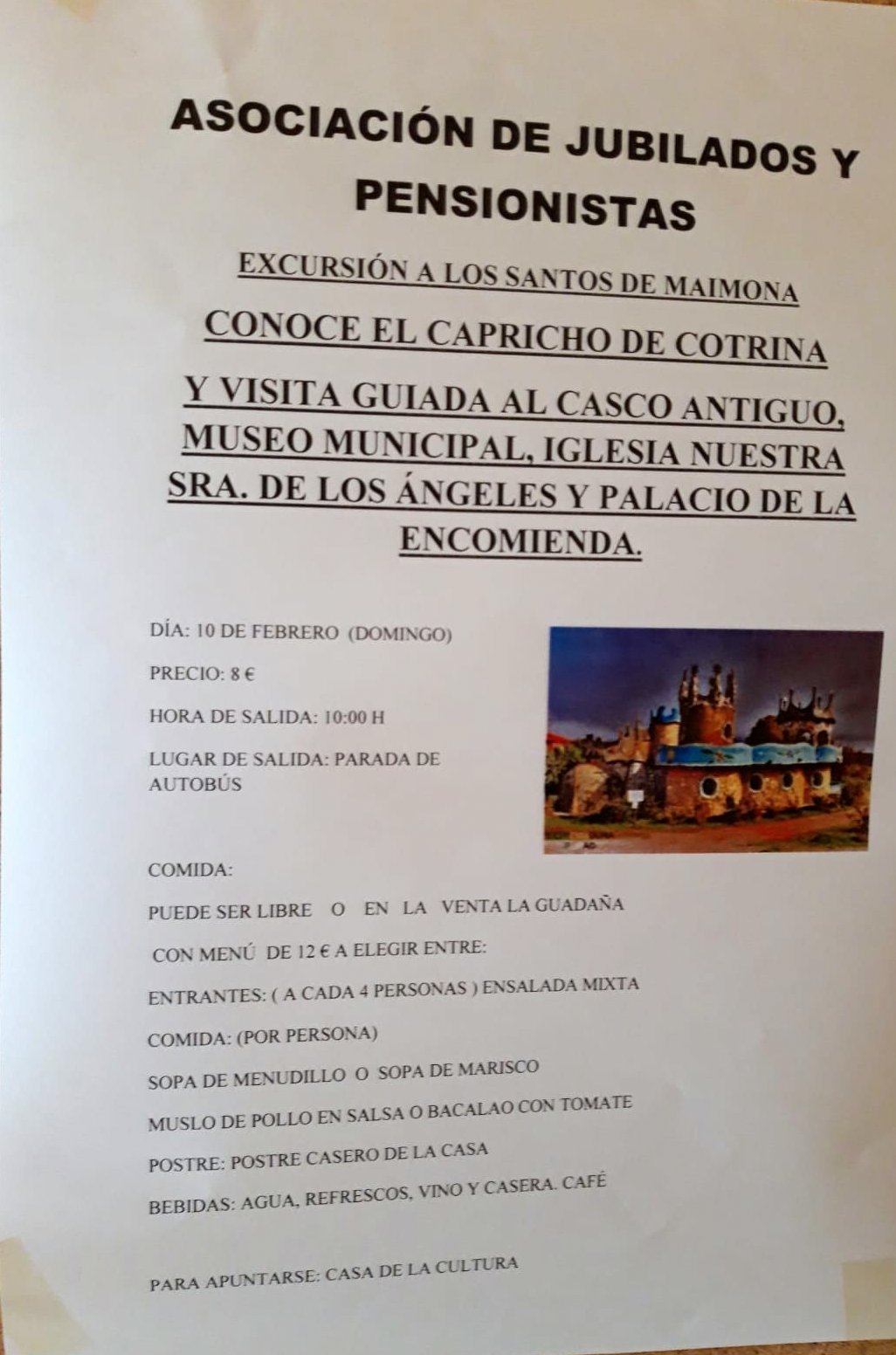 EXCURSIÓN LOS SANTOS DE MAIMONA2019-01-23 13:02:01Info GeneralConoce El Capricho de Cotrina y visita guiada al casco antiguo, museo municipal, Iglesia Ntra Sra de Los Angeles y el Palacio de La Encomienda.