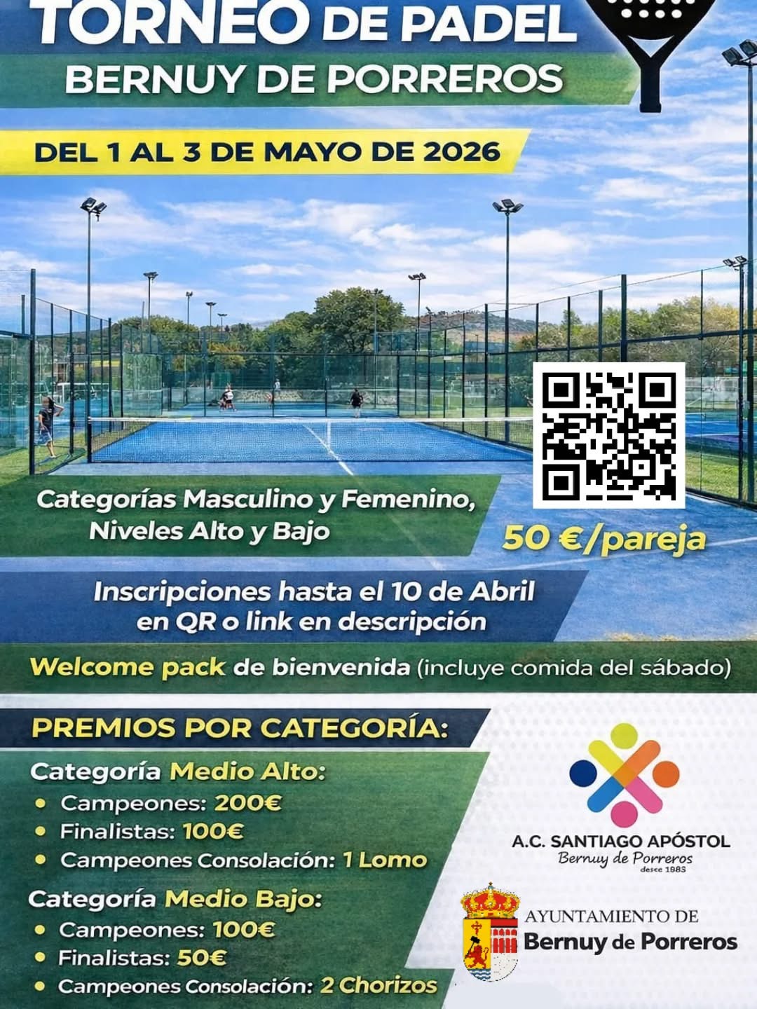 La Asociación Cultural Santiago Apóstol organiza en _Bernuy de Porreros_ su *🎾IV TORNEO DE PADEL BERNUY DE PORREROS🥎* al que estáis todos invitados.