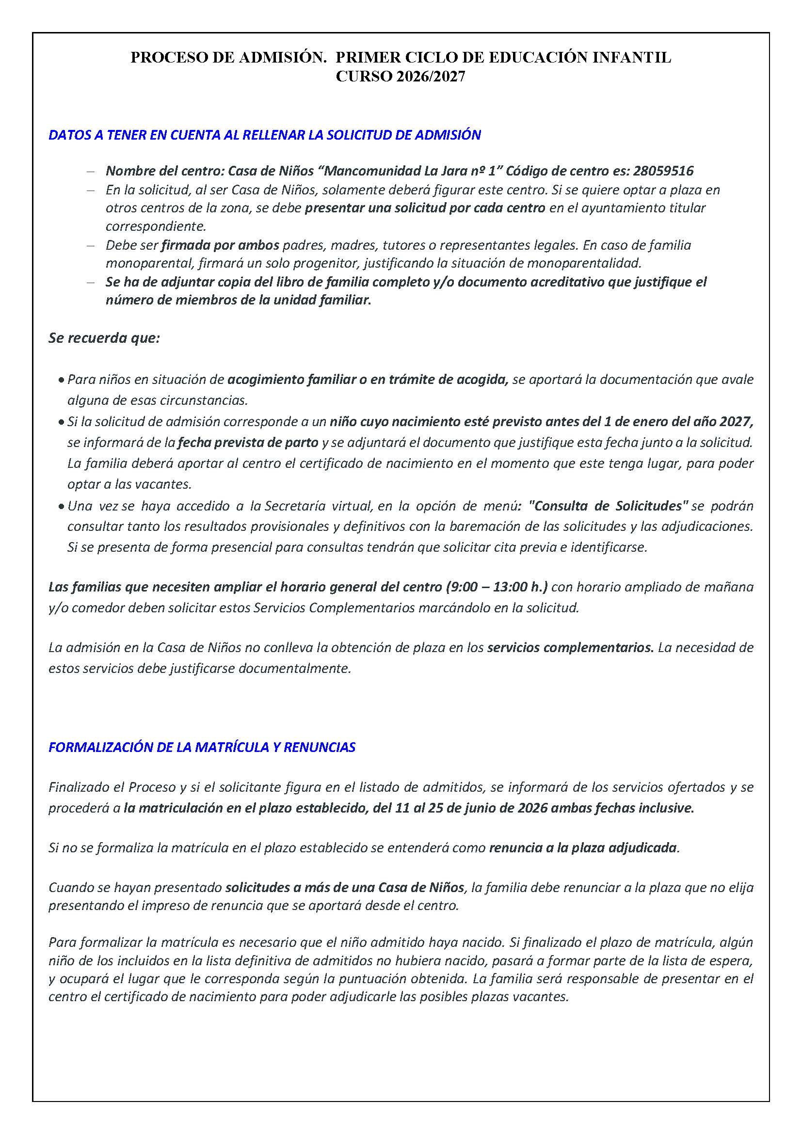 📢 Periodo de admisión – Casa de Niños Curso 2026/2027