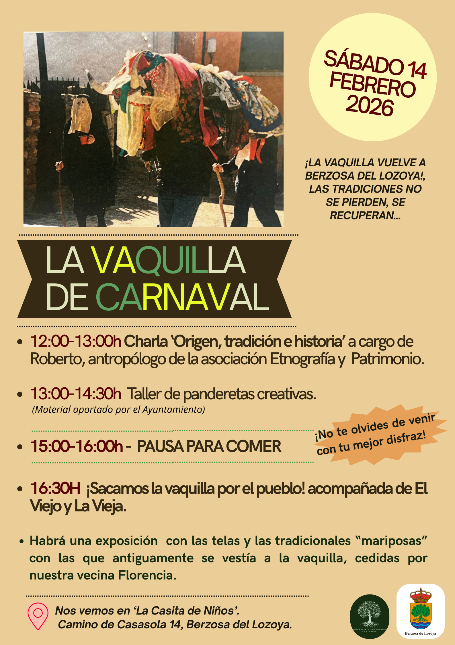 El Ayuntamiento de Berzosa del Lozoya informa a todos los vecinos y vecinas de la celebración de La Vaquilla de Carnaval, que tendrá lugar el sábado 14 de febrero de 2026.