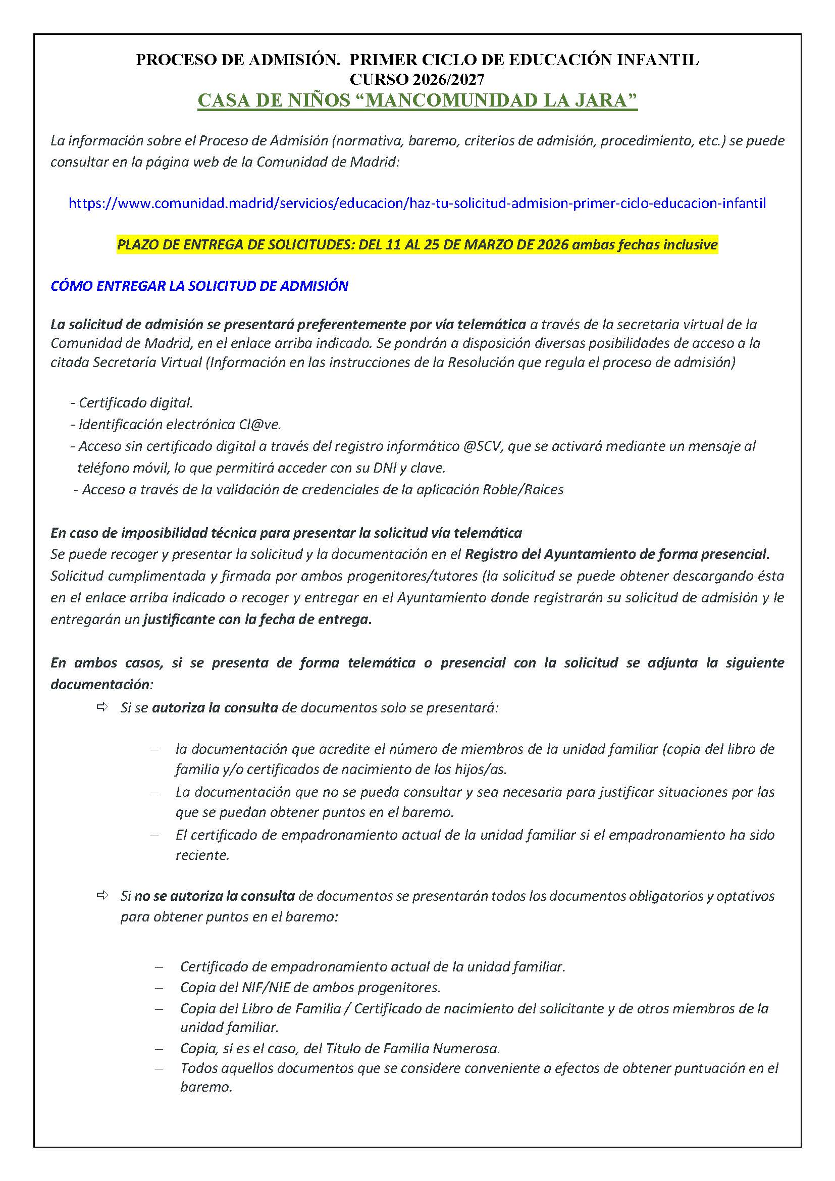 COMUNICACIÓN VACANTES EN ADMISIÓN CASA DE NIÑOS CURSO 2026/2027