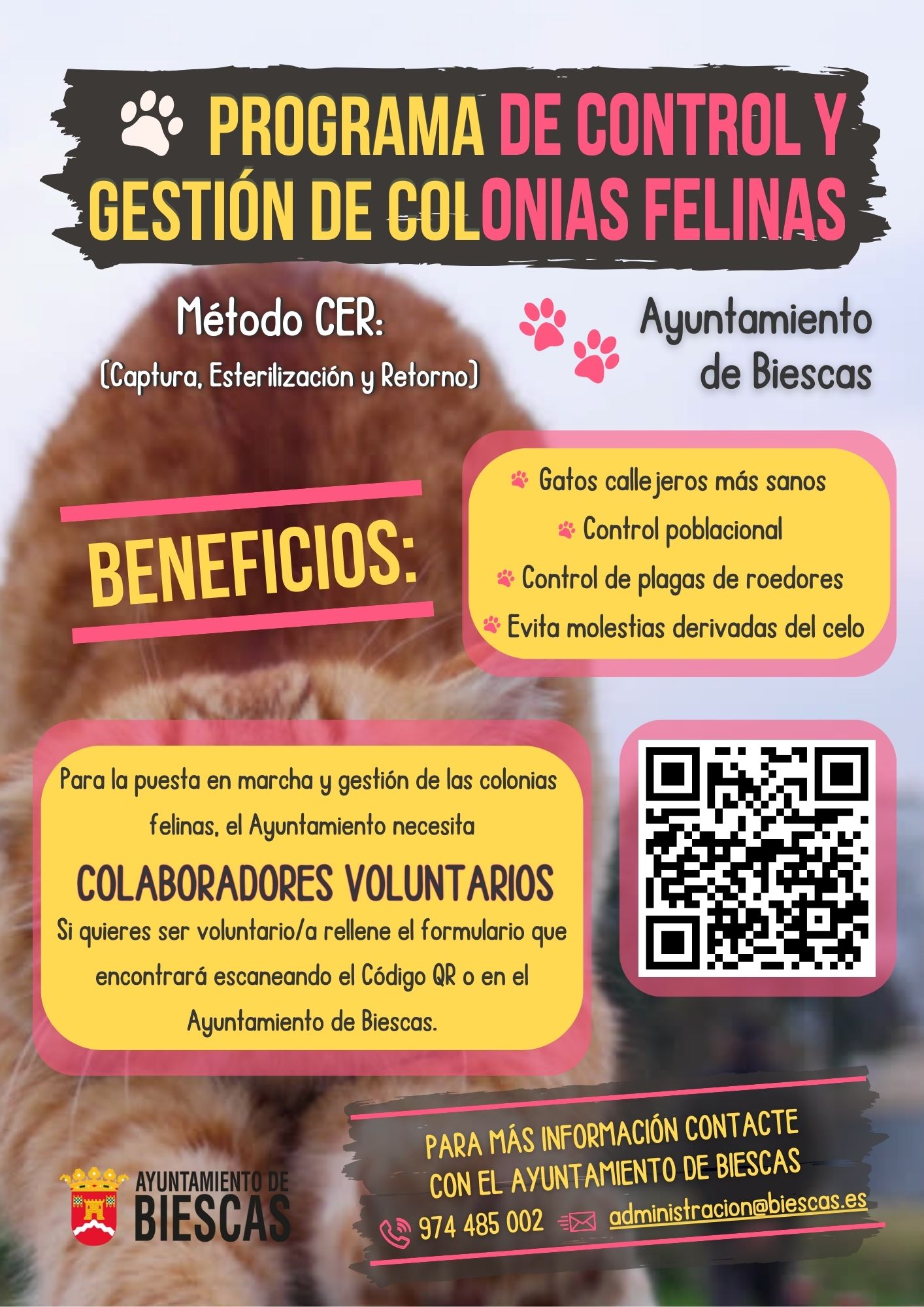 Para la puesta en marcha el ayuntamiento necesita COLABORADORES VOLUNTARIOS, si estás interesado y quieres hacerte colaborador voluntario, pincha en el siguiente enlace https://bit.ly/ColoniasFelinasBIESCAS y rellena la ficha de voluntario.