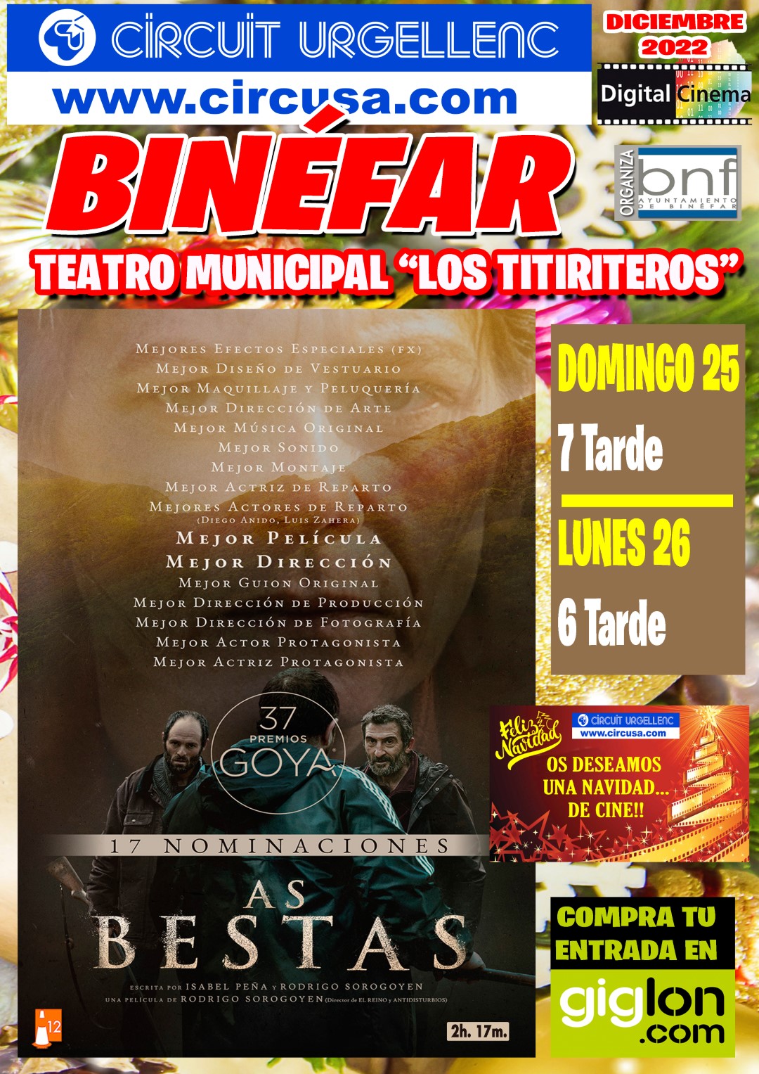 Cartelera de cine para el fin de semana2022-12-21 11:21:56CulturaCartelera de cine en Binéfar este fin de semana: As Bestas, película galardonada con 37 premios Goya, en la sala de cine del Teatro Municipal.