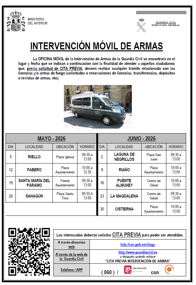 Adjunto remito calendario de La OFICINA MÓVIL de la Intervención de Armas de la Guardia Civil, que se encontrará en Riaño el día 9 de junio de 2026, en la Plaza de Cimadevilla, en horario de 10:00 a 13:00 horas, con la finalidad de atender a aquellos ciudadanos que, previa solicitud de CITA PREVIA, deseen realizar cualquier trámite relacionado con las licencias y/o armas de fuego (solicitudes o renovaciones de licencias, transferencias, depósitos o revistas de armas, etc).