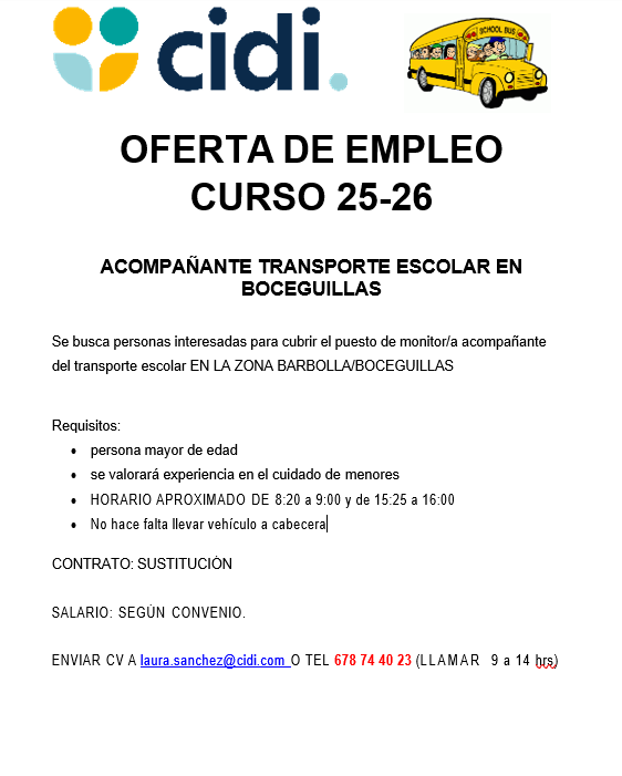 Se buscan personas interesadas para cubrir el puesto de monitor/a acompañante de transporte escolar ENLA ZONA BARBOLLA/BOCEGUILLAS.