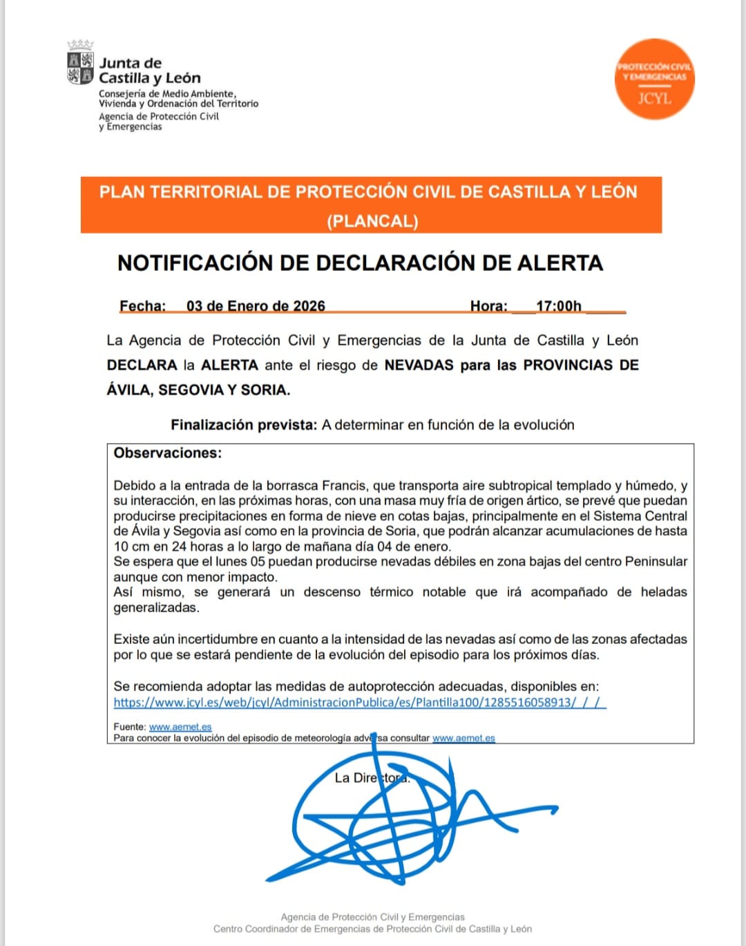 La agencia de Protección Civil y Emergencias de la Junta de Castilla y León, DECLARA la ALERTA ante el riesgo de NEVADAS para las provincias de SEGOVIA, ÁVILA y SORIA.