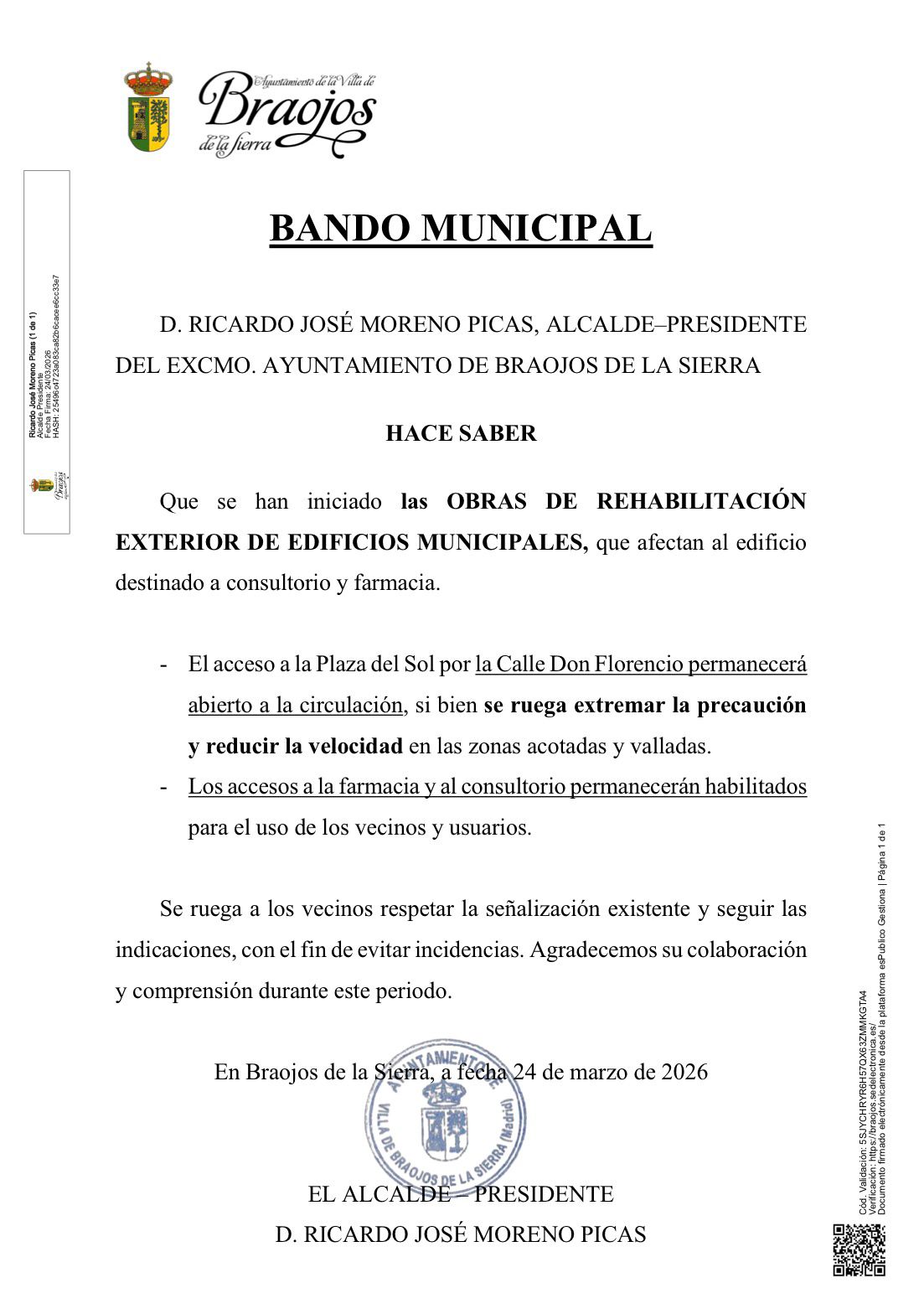Debido a la situación climatológica adversa registrada en el día de hoy en el municipio de Braojos, así como a las fuertes nevadas que han ocasionado dificultades en la movilidad de los vecinos del municipio, el Ayuntamiento pone a disposición un justificante/certificado oficial que acredita esta circunstancia a efectos de justificación laboral, escolar o de cualquier índole.