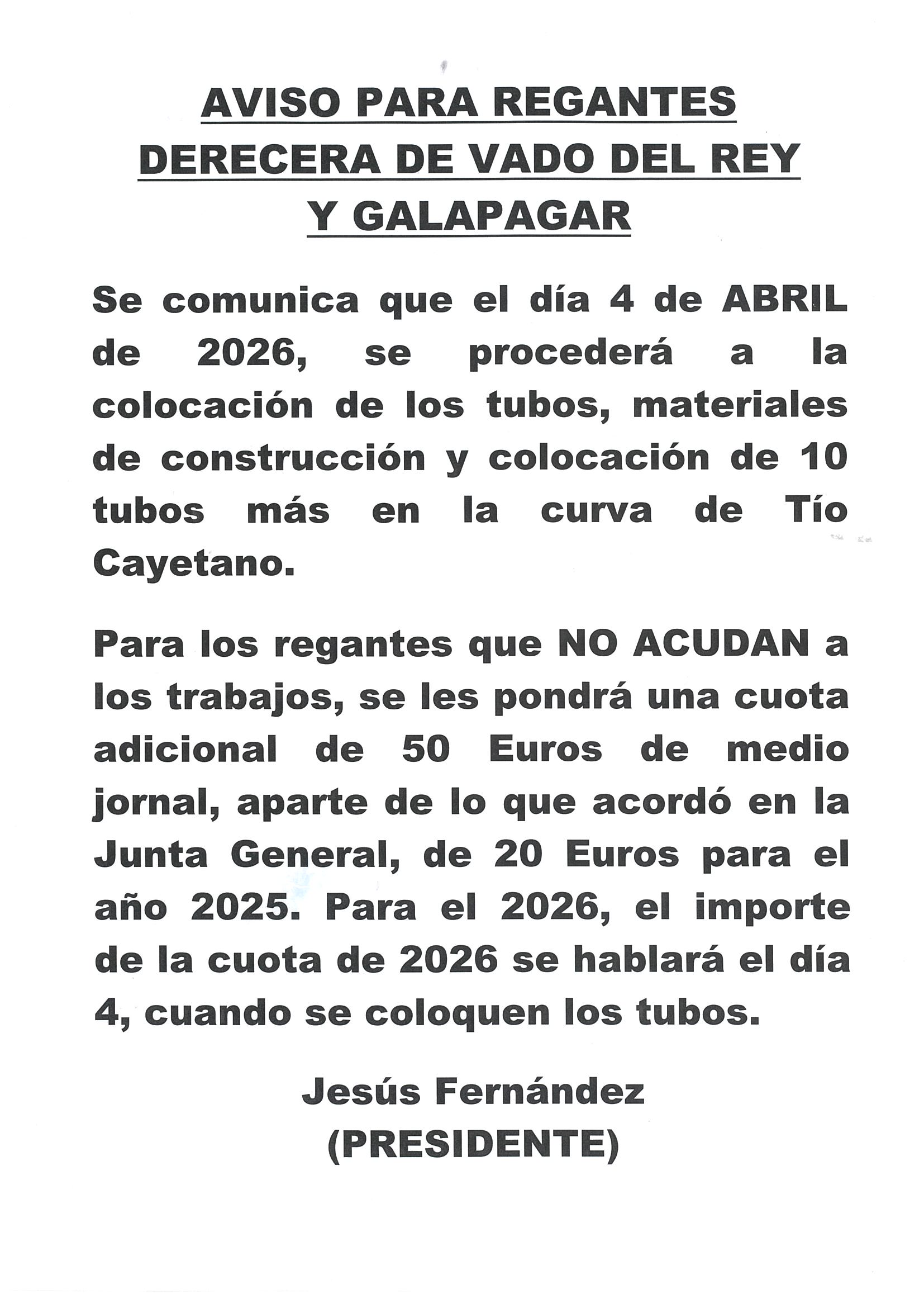Para los regantes que no acudan a los trabajos, se les pondrá una cuota adicional de 50€ de medio jornal, aparte de lo que se acordó en la Junta General, de 20€ para el año 2025. Para el 2026, se hablará el día 4 cuando se coloquen los tubos.