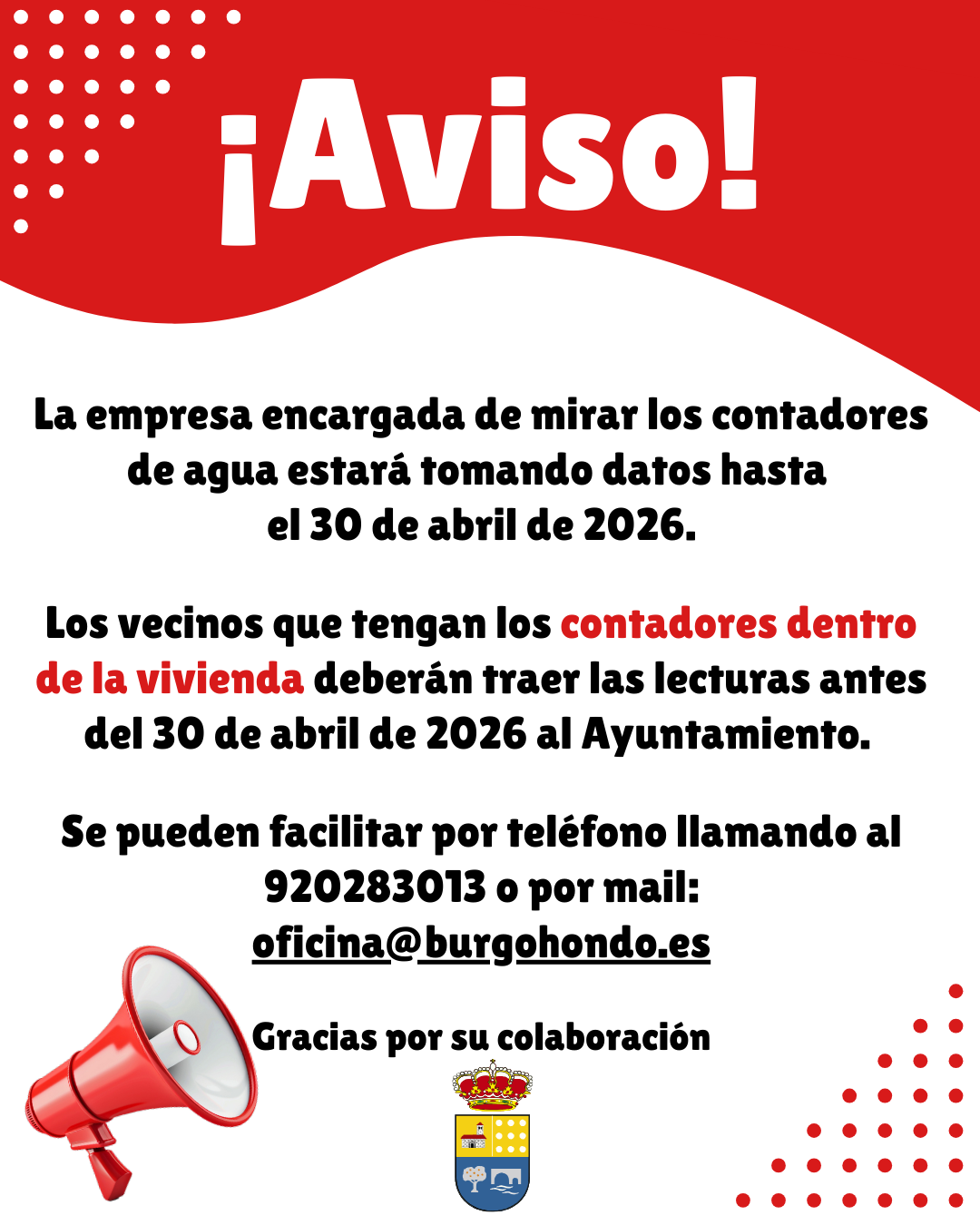 Los vecinos que tengan los contadores dentro de la vivienda deberán traer las lecturas antes del 30 de abril de 2026 al Ayuntamiento.