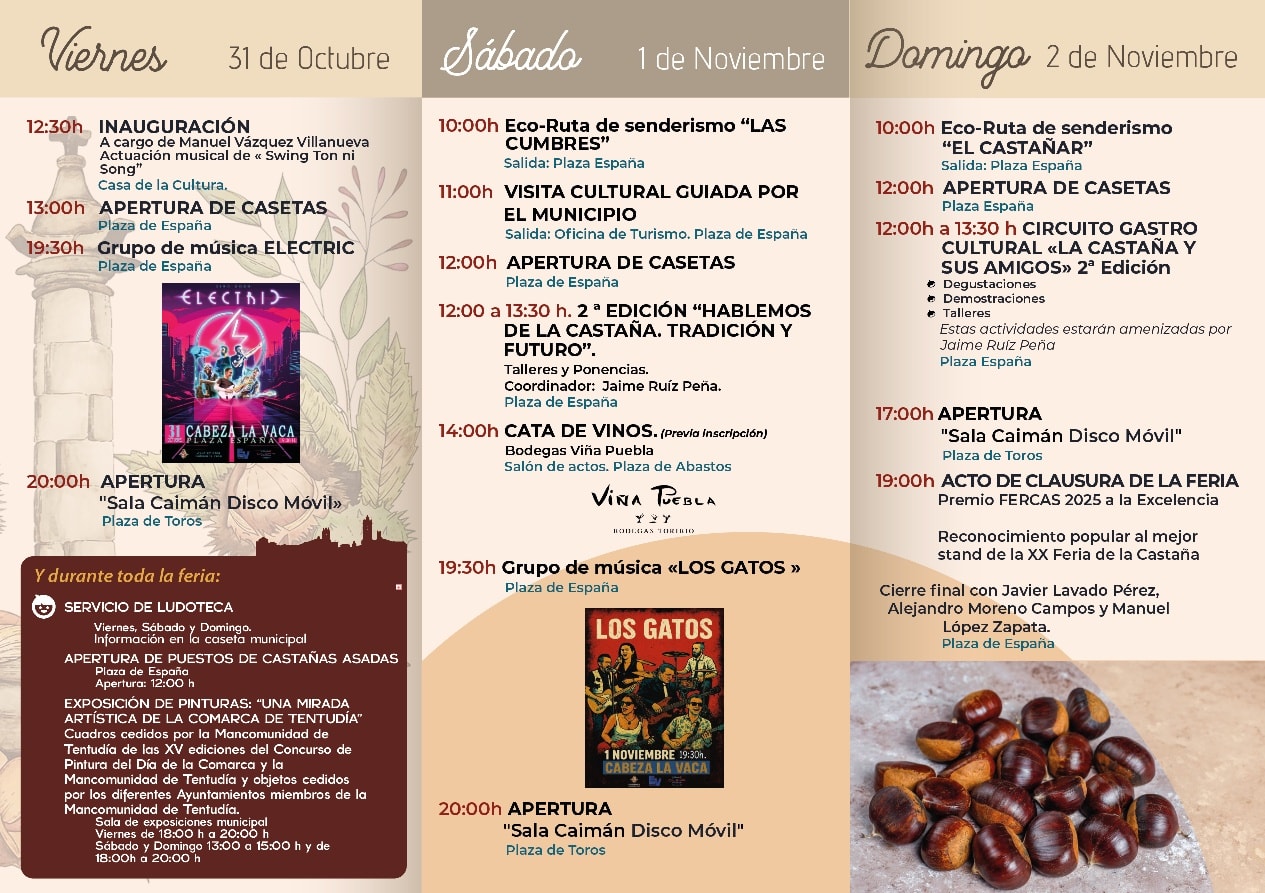 Del 31 de octubre al 2 de noviembre de 2025 celebramos la vigésima edición de la Feria de la Castaña, un proyecto que se ha convertido en todo un orgullo para nuestro pueblo.
