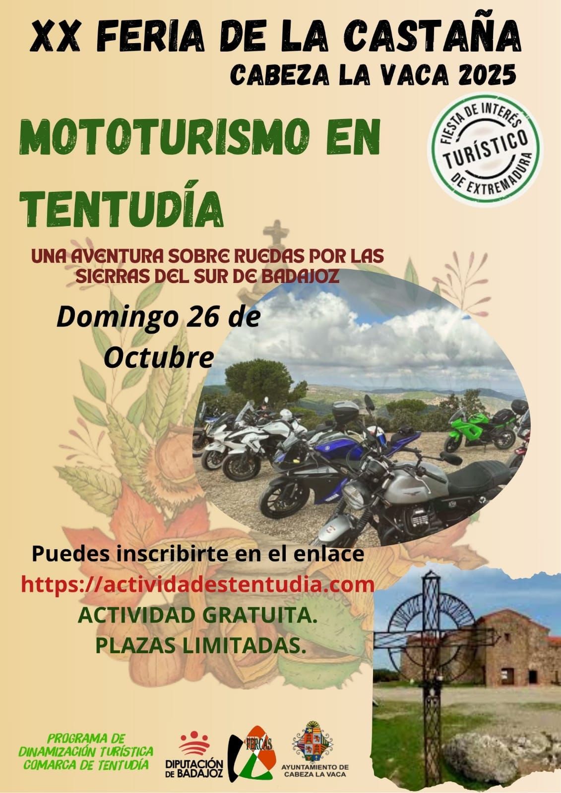 ¿Te gusta la aventura y las rutas en moto? Vive una experiencia inolvidable recorriendo las sierras del sur de Badajoz con esta emocionante propuesta de Mototurismo en Tentudía, dentro de la XX Feria de la Castaña de Cabeza la Vaca 2025, declarada Fiesta de Interés Turístico de Extremadura.