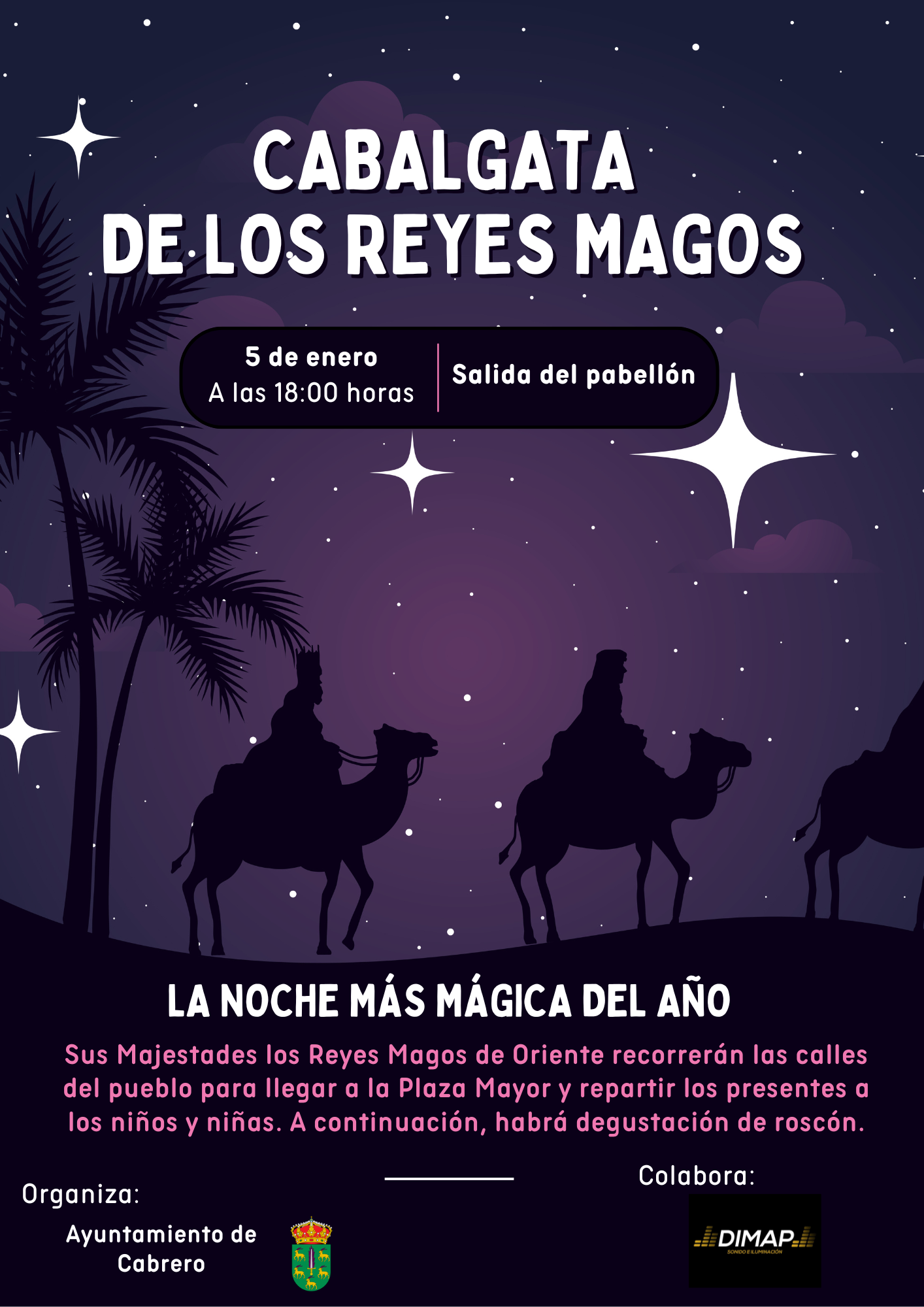 Llega la noche más mágica del año, pero antes Melchor, Gaspar y Baltasar pasarán por Cabrero para dejar algunos regalos a los niños y niñas. Sus Majestades los Reyes Magos saldrá del pabellón a las 18:00 horas, el día 5 de enero y recorrerán las calles del pueblo hasta llegar a la Plaza Mayor donde entregarán los presentes.