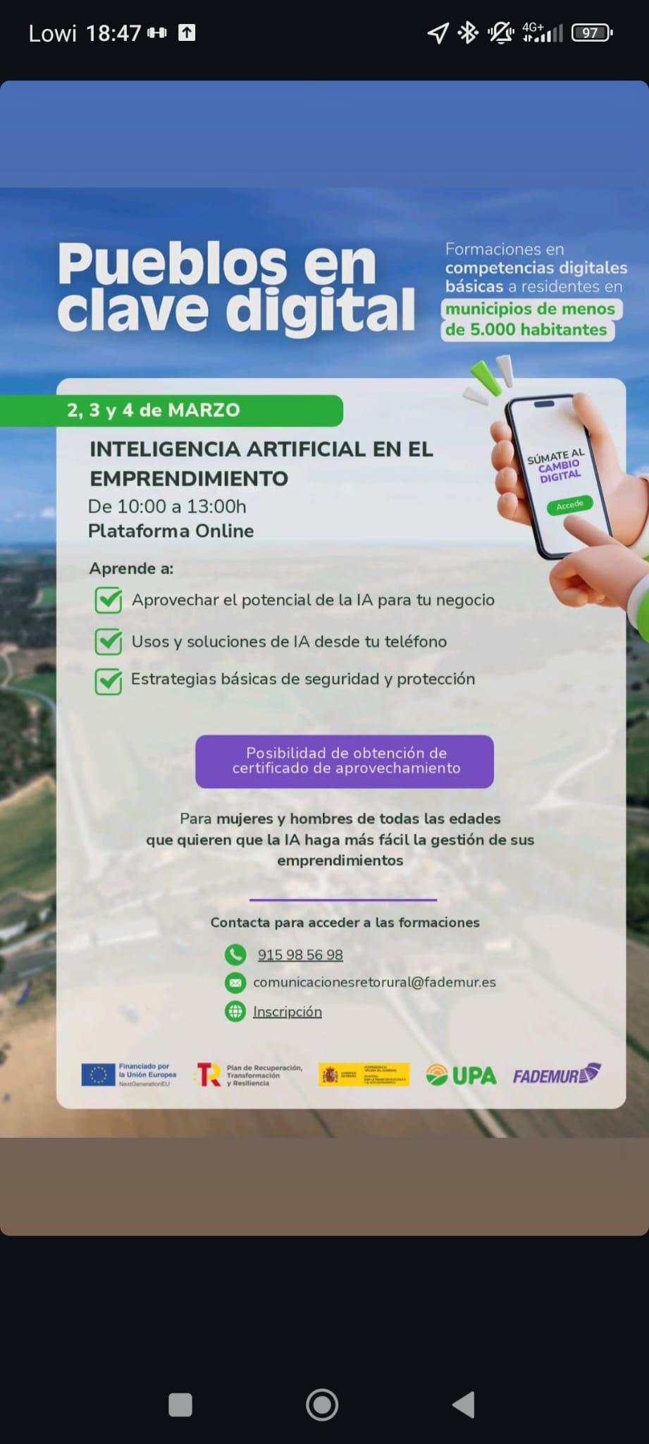 INTELIGENCIA ARTIFIAL Y EMPREDIMIENTO. SE ADJUNTA CARTEL INFORMATIVO Y ENLACE DE INSCRIPCIÓN .
