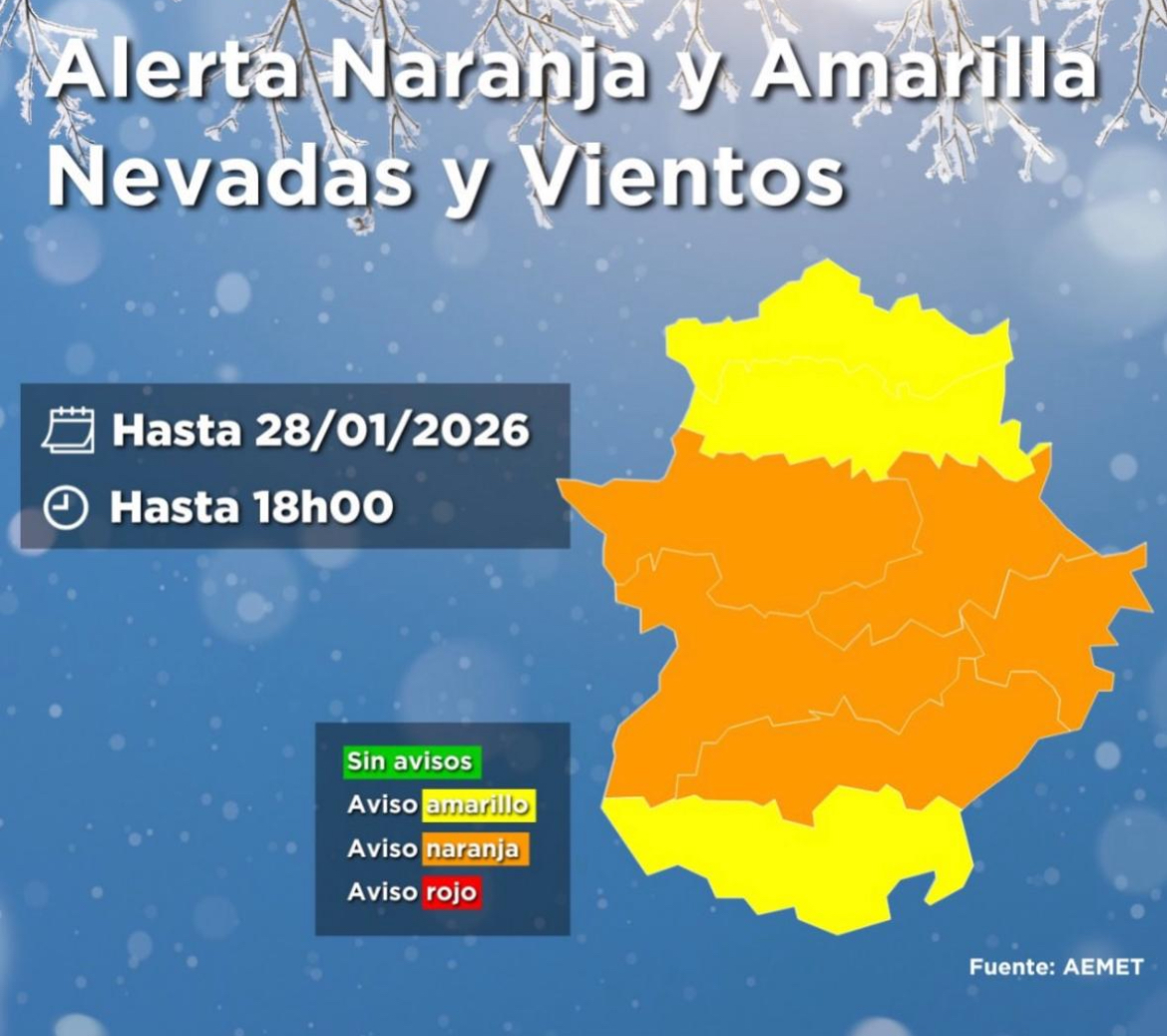 Ampliación AEMET FMA Permanece activa ALERTA NARANJA por Lluvias Zona Norte de la provincia de Cáceres Precipitación 12h: 80mm de 15:00 h del 26 a 12:00 h del 27 y ACTIVA ALERTA AMARILLA por vientos para la Provincia de Cáceres y las zonas Siberia Extremeña, Vegas del Guadiana y Barros y Serena en la provincia de Badajoz. Rachas: 70Km/h de 00:00h a 11:00h del día 27/01/26. Más información en web 112 y AEMET. Centro112. -