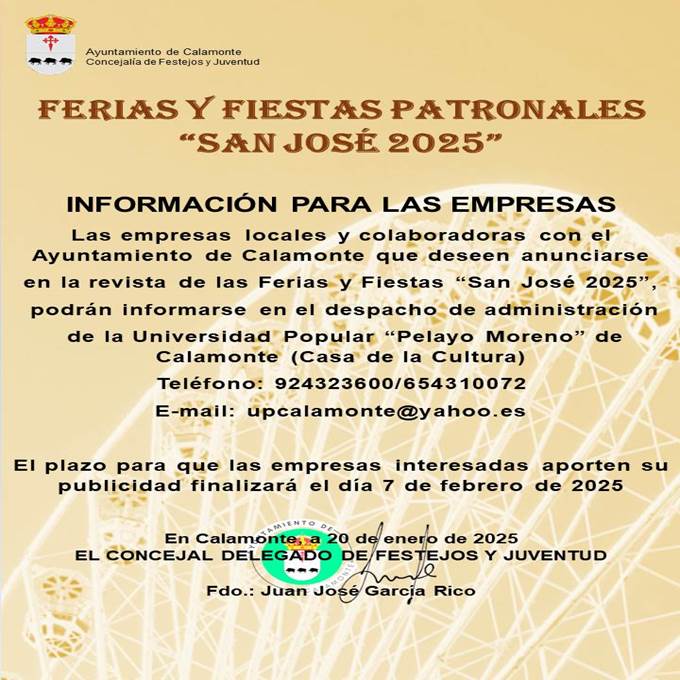 PUBLICACIÓN ANUNCIO DE EMPRESAS EN LA REVISTA FERIA Y FIESTAS "SAN JOSÉ 2025"2025-01-21 16:43:18FESTEJOS Y JUVENTUDSi tienes una empresa en Calamonte y estas interesado en incluir un anuncio publicitario en la Revista de la Feria y Fiestas "San José 2025",