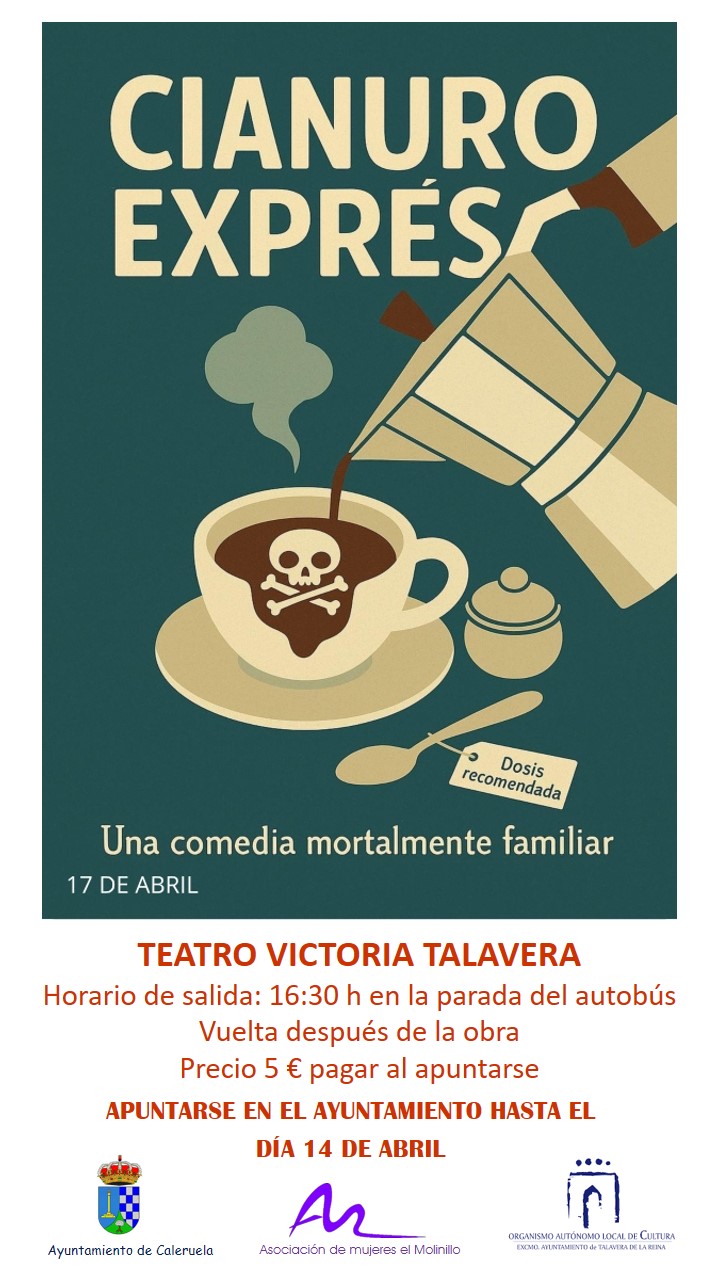 El viernes, 17 de abril de 2026, se organiza una excursión a Talavera para asistir a la obra "Cianuro Exprés" en el Teatro Victoria (19:00 h).- Hora de salida (desde la parada del bus): 16:30 h.
