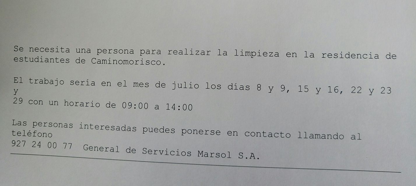 OFERTA EMPLEO LIMPIEZA RESIDENCIA ESTUDIANTES CAMINOMORISCO2017-06-29 14:36:04CulturaOFERTA DE EMPLEO DE LA EMPRESA GENERAL DE SEVICIOS MARSOL S.A