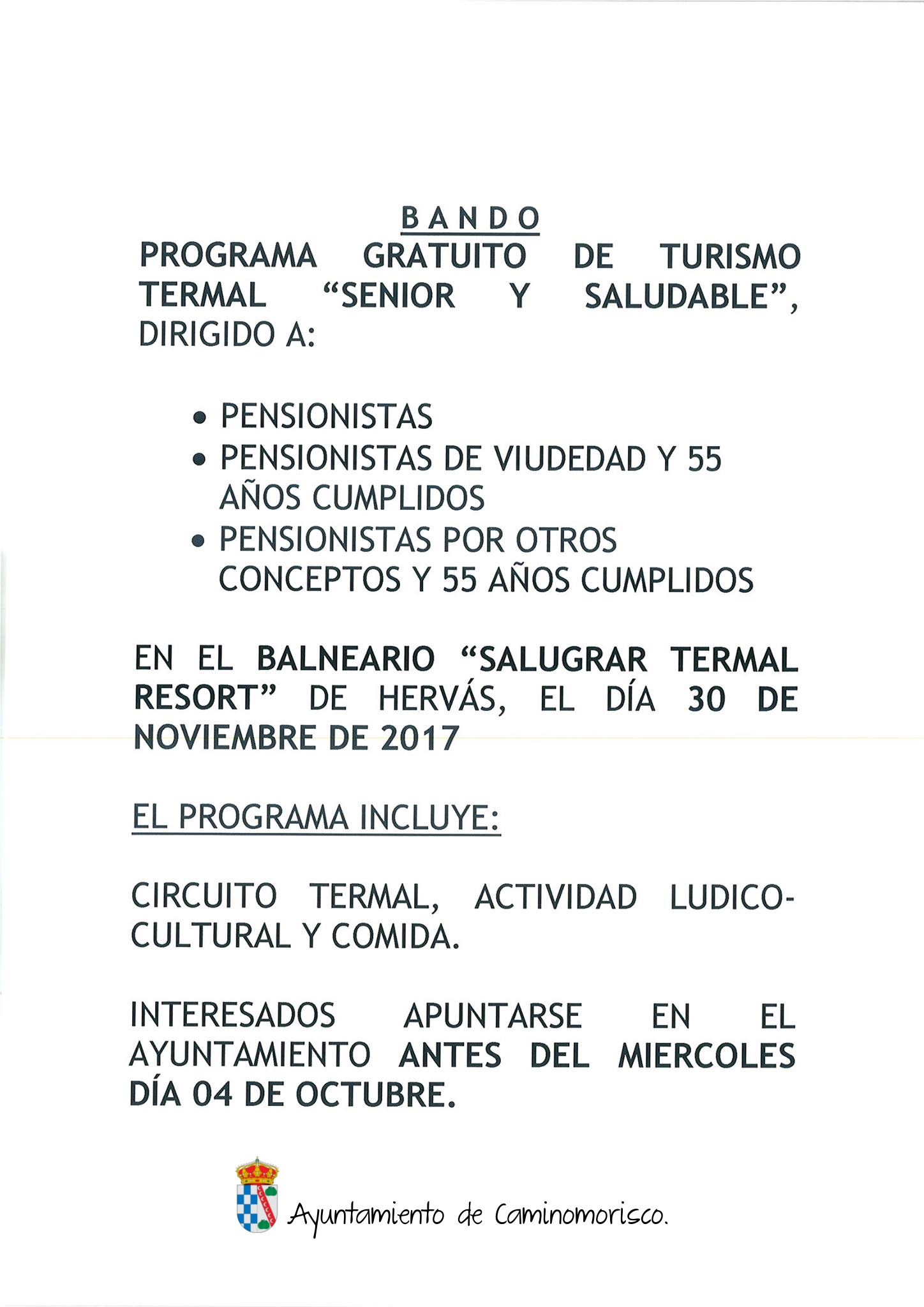 VIAJE GRATUITO BALNEARIO HERVÁS DÍA 30 NOVIEMBRE2017-10-02 10:02:28CulturaViaje gratuito dentro del programa \" TURISMO TERMAL SENIOR Y SALUDABLE\" de Diputación de Cáceres. Plazas limitadas, por orden de inscripción. 30 Noviembre 2017. Inscripciones en el Ayuntamiento 927435193 hasta el día 4 como máximo.