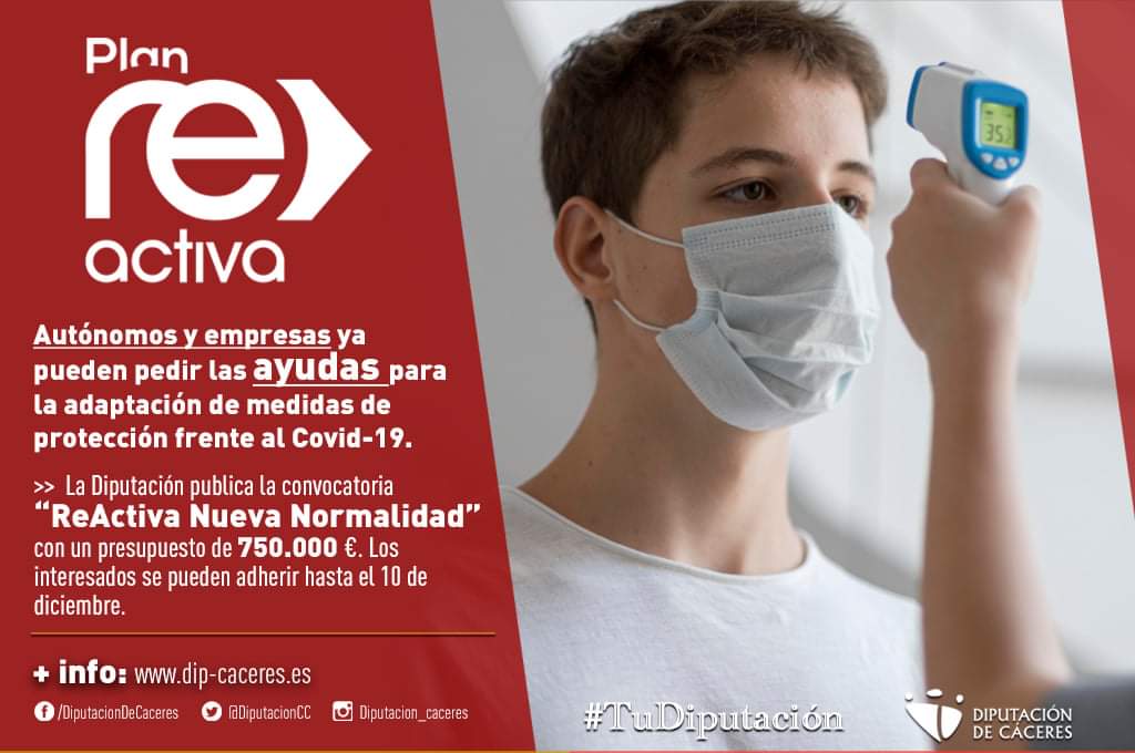 Ayudas a autónomos y empresas por la Diputación de Cáceres.2020-11-21 18:52:10CulturaABIERTO PLAZO para solicitar ayudas ReActiva "Nueva Normalidad" dotadas con 750.000 € para ayudar a autónomos y empresas de municipios con menos de 20.000 habitantes y entidades locales menores de la provincia en la adaptación de medidas de protección frente al Covid-19.