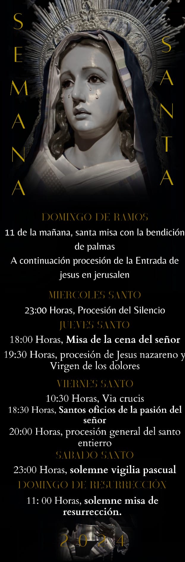 Os adjuntamos el cartel anunciador de nuestra Semana Santa (diseñado por Alfonso Vázquez García). En el mismo aparece la imagen de nuestra Virgen de los Dolores, imagen que ha sido restaurada recientemente por el grupo parroquial.