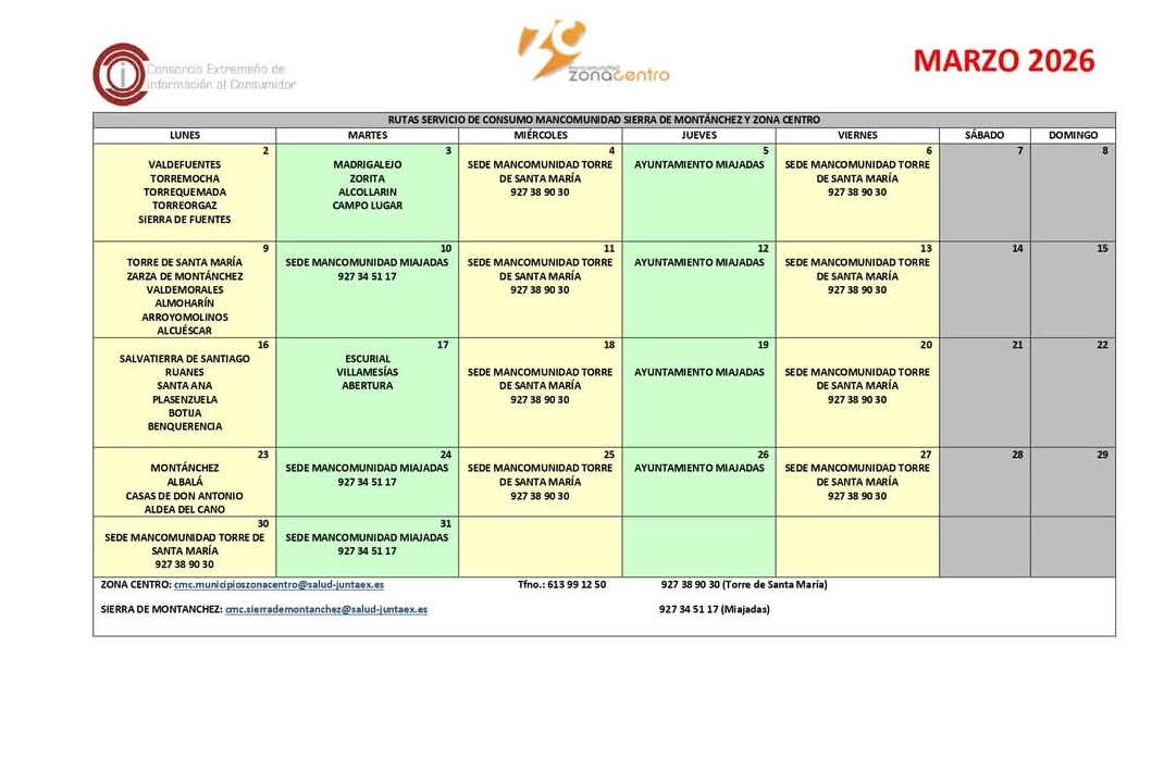 Se adjunta el Calendario de Rutas del Servicio de Consumo Febrero 2026