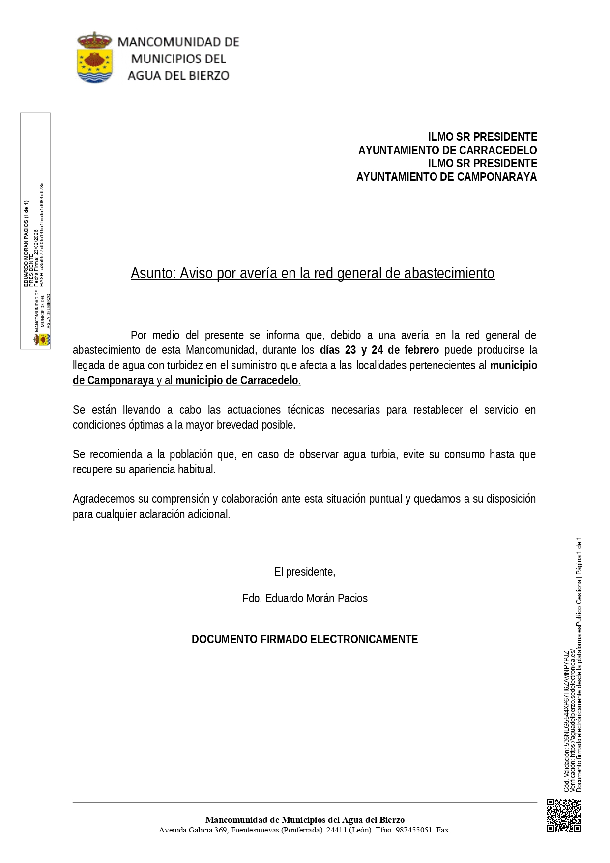 AVISO POR AVERÍA EN LA RED GENERAL DE ABASTECIMIENTO DE AGUA