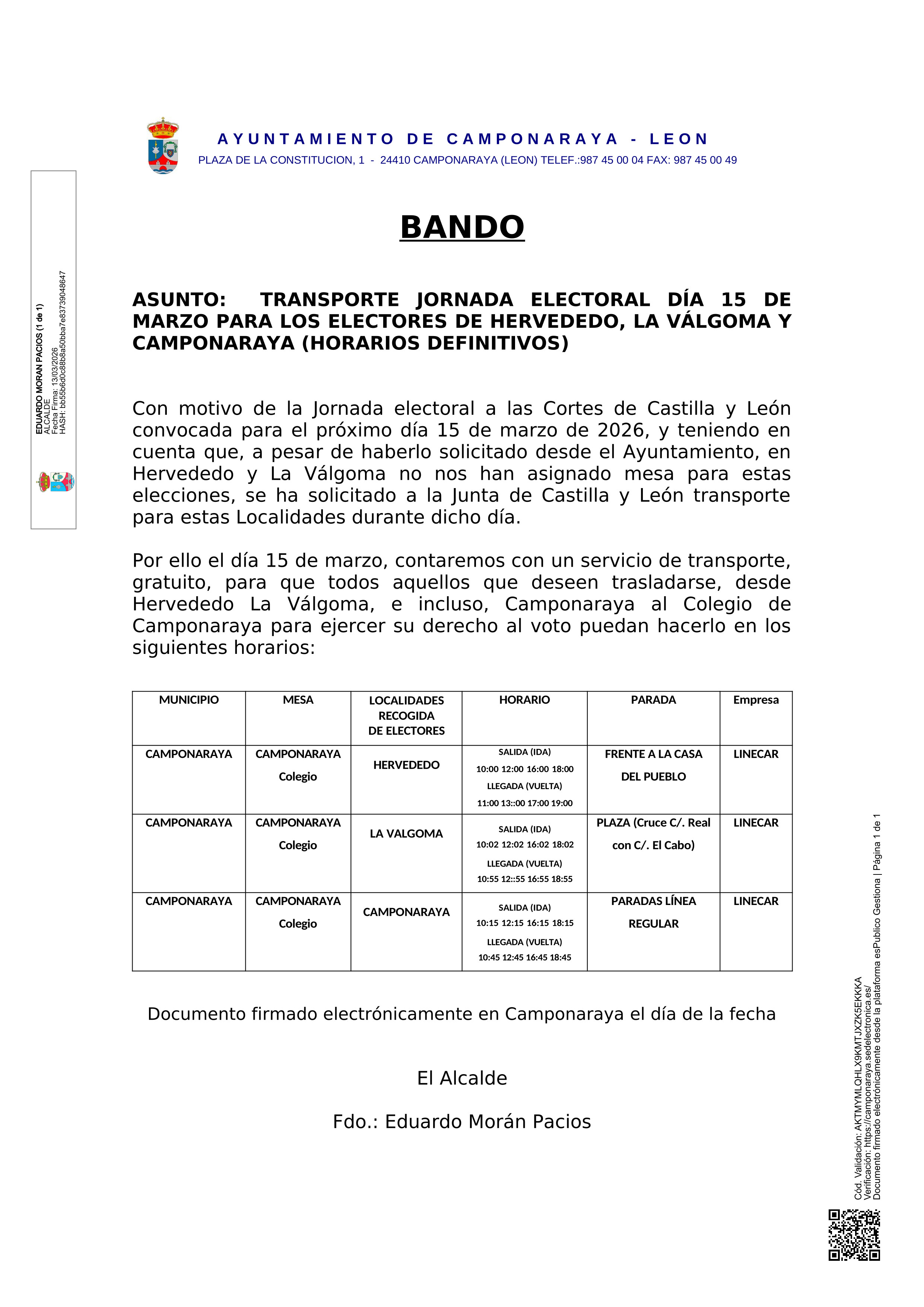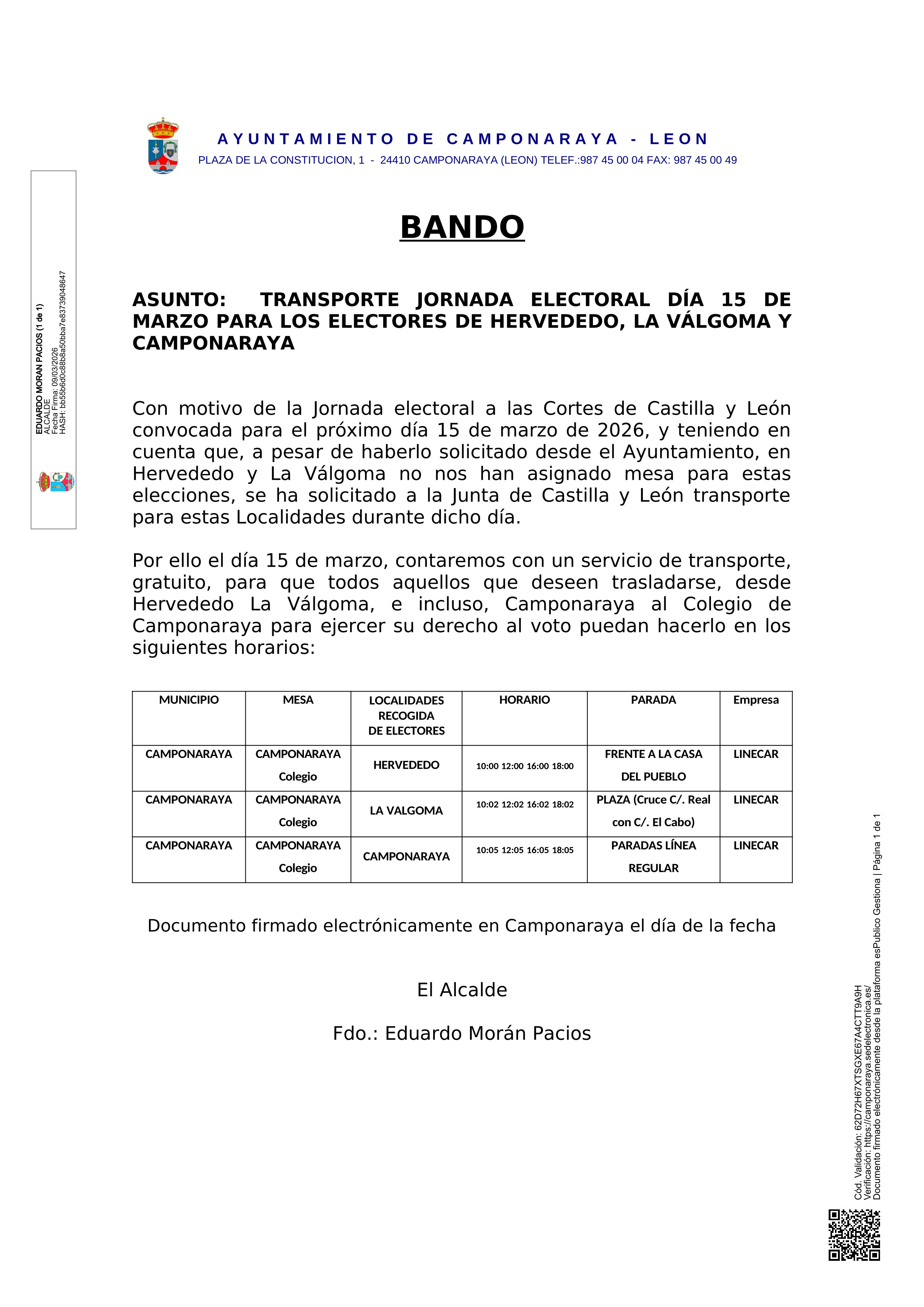 📢 EL AYUNTAMIENTO DE CAMPONARAYA INFORMA QUE, CON MOTIVO DE LA JORNADA ELECTORAL DEL 15 DE MARZO, SE OFRECERÁ UN SERVICIO DE TRANSPORTE GRATUITO PARA QUIENES DESEEN DESPLAZARSE DESDE HERVEDEDO, LA VALGOMA Y CAMPONARAYA AL COLEGIO DE CAMPONARAYA PARA EJERCER SU DERECHO AL VOTO.