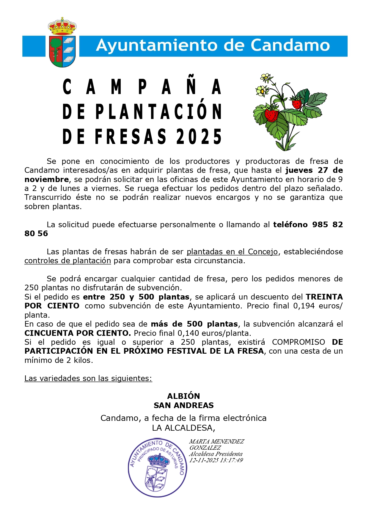 Se pone en conocimiento de los productores y productoras de fresa de Candamo interesados/as en adquirir plantas de fresa, que hasta el jueves 27 de noviembre, se podrán solicitar en las oficinas de este Ayuntamiento en horario de 9 a 2 y de lunes a viernes. Se ruega efectuar los pedidos dentro del plazo señalado. Transcurrido éste no se podrán realizar nuevos encargos y no se garantiza que sobren plantas.