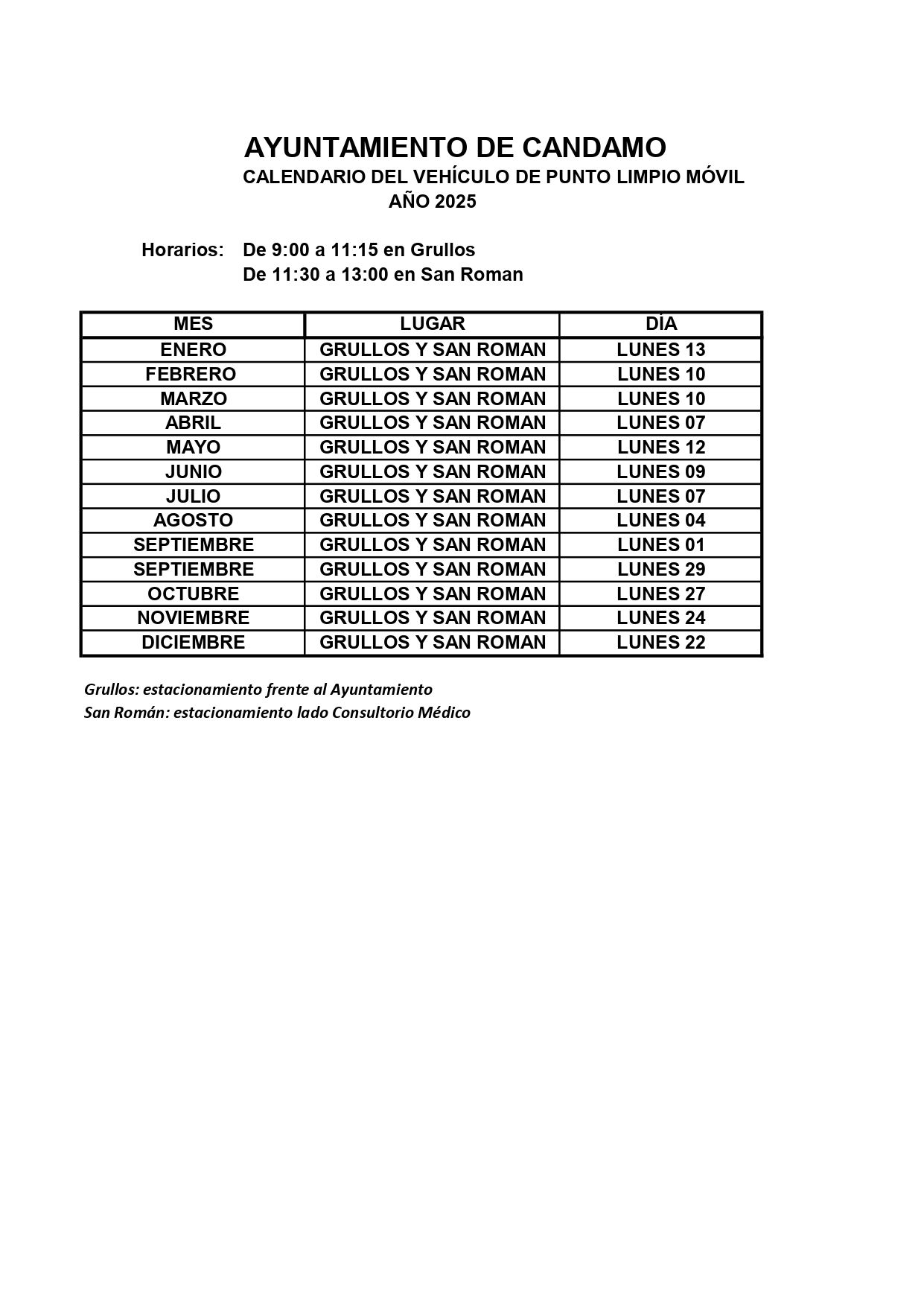 El Ayuntamiento de Candamo en colaboración con COGERSA, al igual que en años anteriores, dispondrá de un punto limpio móvil durante el presente año, un día al mes, en Grullos con horario de 9.30 a 11.15h en el aparcamiento del Ayto. y en San Román de Candamo en horario de 11.30 a 13.00h en la Plaza de Fumayor ( Aparcamiento del Consultorio Médico).