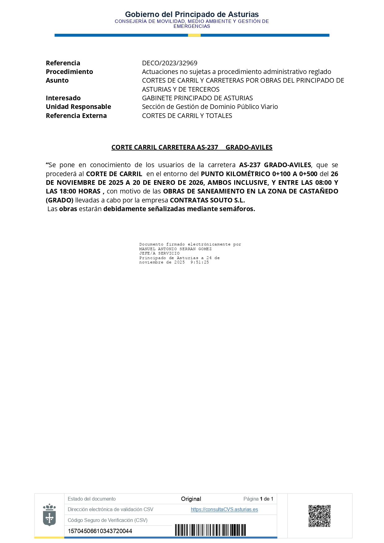 “Se pone en conocimiento de los usuarios de la carretera AS-237 GRADO-AVILES, que se procederá al CORTE DE CARRIL en el entorno del PUNTO KILOMÉTRICO 0 100 A 0 500 del 26 de NOVIEMBRE de 2025 a 20 de ENERO de 2026, AMBOS INCLUSIVE, y entre las 08:00 y las 18:00 HORAS(...)