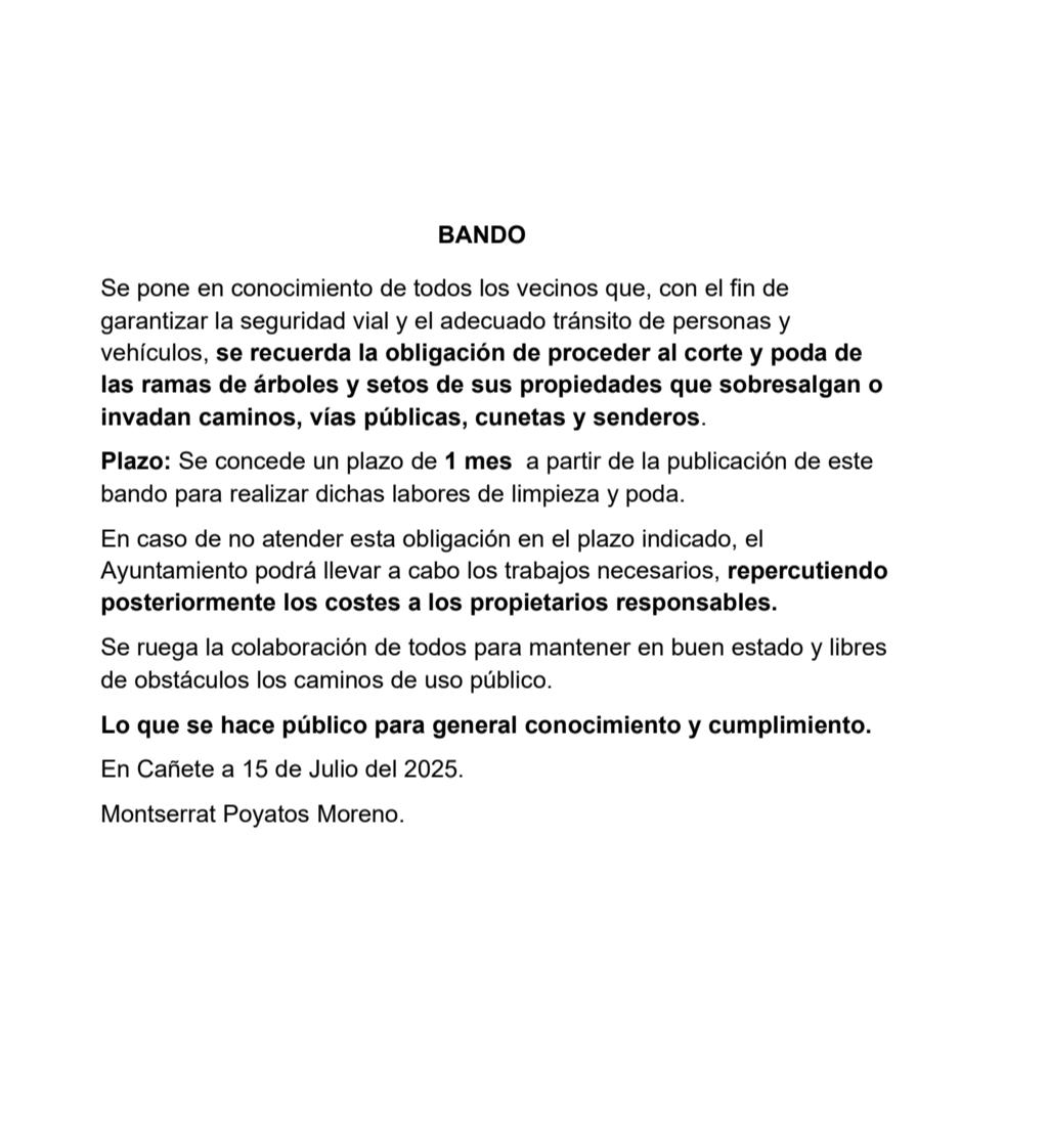 Se pone en conocimiento de todos los vecinos que, con el fin de garantizar la seguridad vial y el adecuado tránsito de personas y vehículos, se recuerda la obligación de proceder al corte y poda de las ramas de árboles y setos de sus propiedades que sobresalgan o invadan caminos, vías públicas, cunetas y senderos.