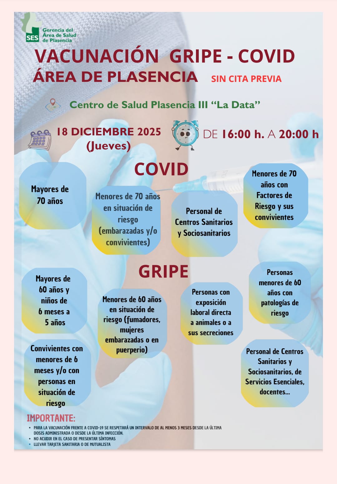 Hoy día 18 de diciembre (jueves), se realizará una vacunación masiva frente a la gripe estacional y la covid-19, para proteger a los colectivos más vulnerables de la Comunidad Autónoma. No hace falta cita previa.