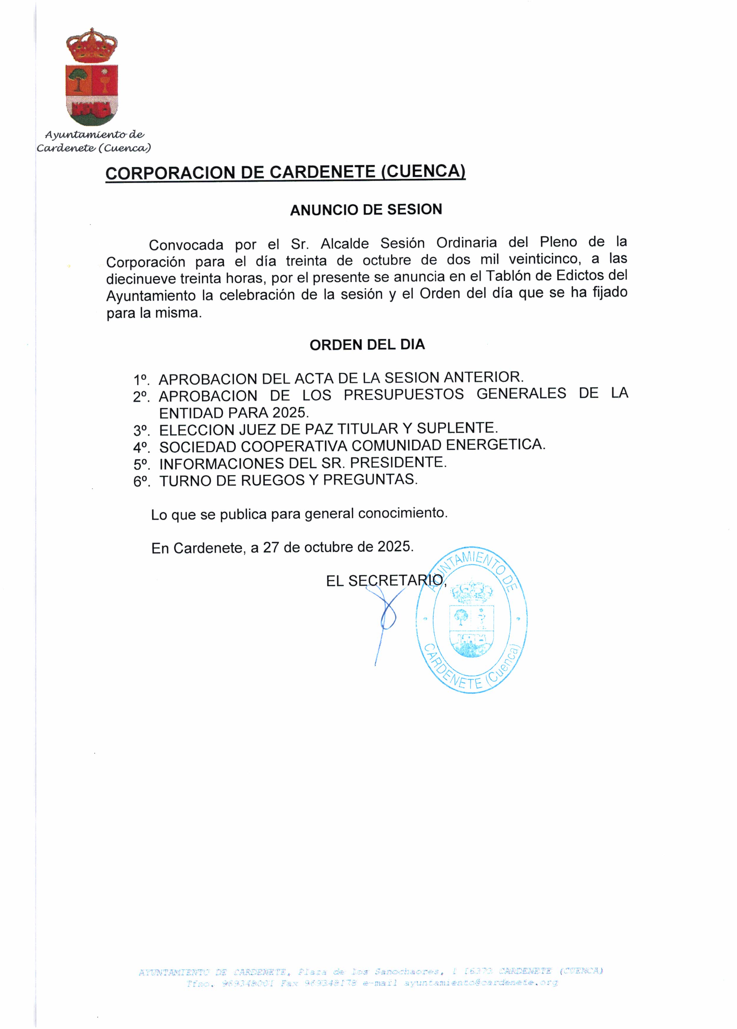 Hoy jueves 30 de octubre a las 19:30 horas, en el Salón de Actos del Ayuntamiento se celebrará la Sesión Ordinaria del Pleno de la Corporación con el siguiente orden del día: