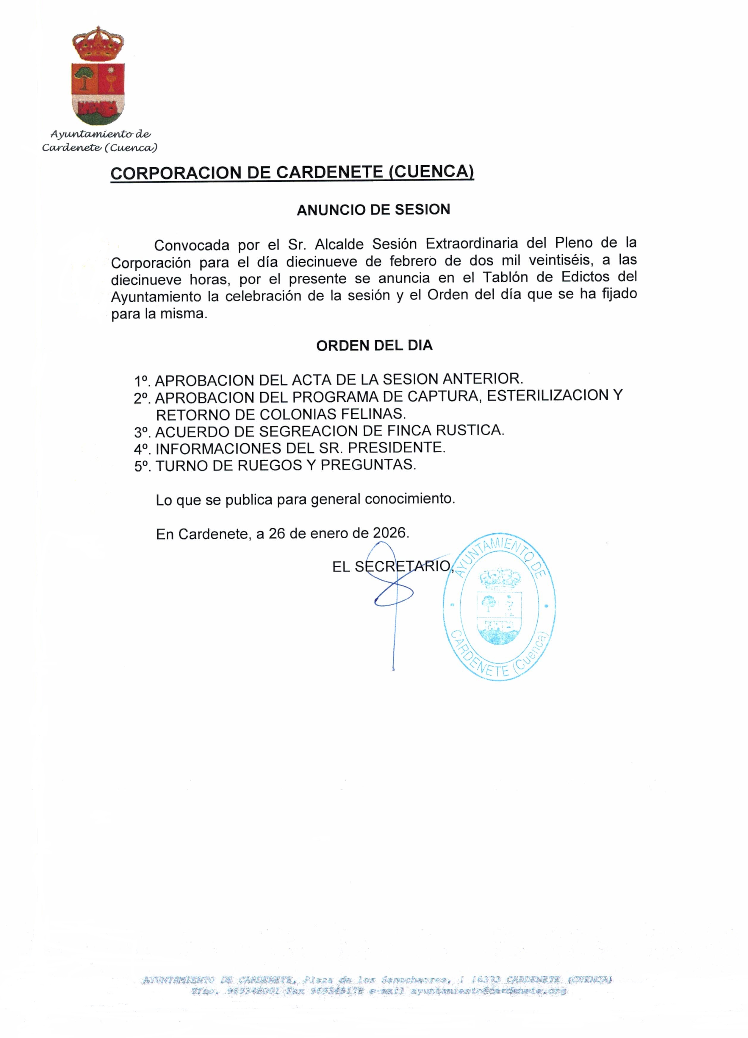 Hoy jueves 19 de febrero a las 19:00 horas, en el Salón de Actos del Ayuntamiento se celebrará la Sesión Extraordinaria del Pleno de la Corporación con el siguiente orden del día: