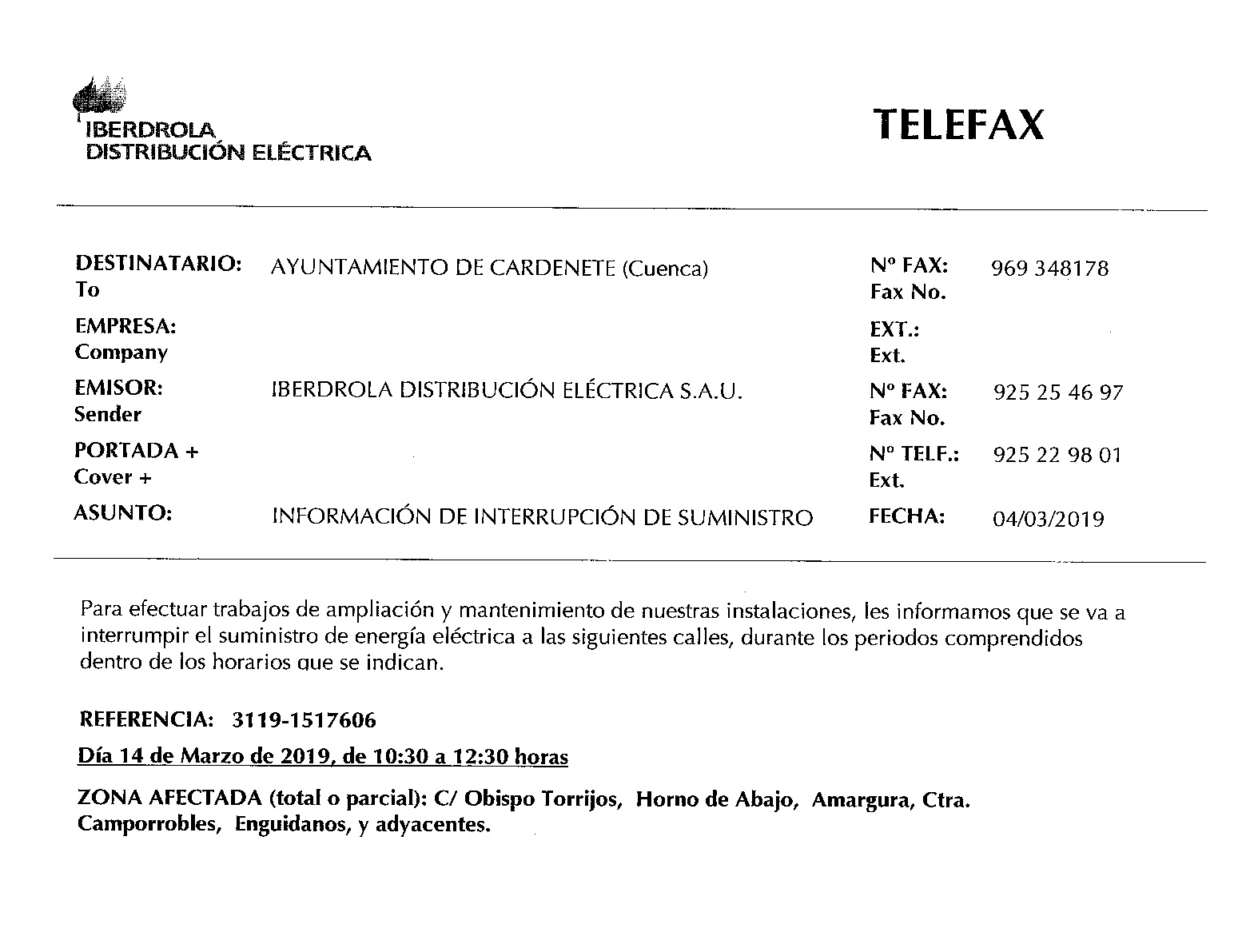 CORTE DE LUZ PROGRAMADO2019-03-14 09:30:01Info GeneralCon motivo de los trabajos de ampliación y mantenimiento de las instalaciones de Iberdrola, se va a interrumpir el suministro de energía electrica hoy, jueves 14 de marzo de 10:30 a 12:30 horas en las calles Obispo Torrijos, Horno de Abajo, Amargura, Ctra Camporrobles, Enguídanos y adyacentes
