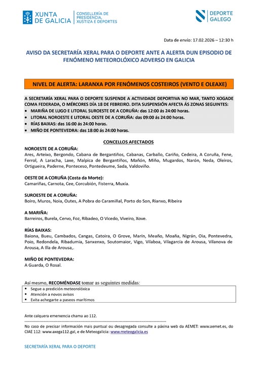 O mércores 11 de febreiro, por mor das condicións meteorolóxicas previstas e a activación da alerta laranxa, suspéndense as seguintes actividades:
