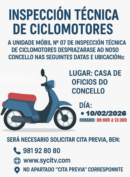 A UNIDADE MÓBIL Nº 7 DE INSPECCIÓN TECNICA DE CICLOMOTORES, DESPRAZASE A CARIÑO NAS SEGUINTES DATAS: