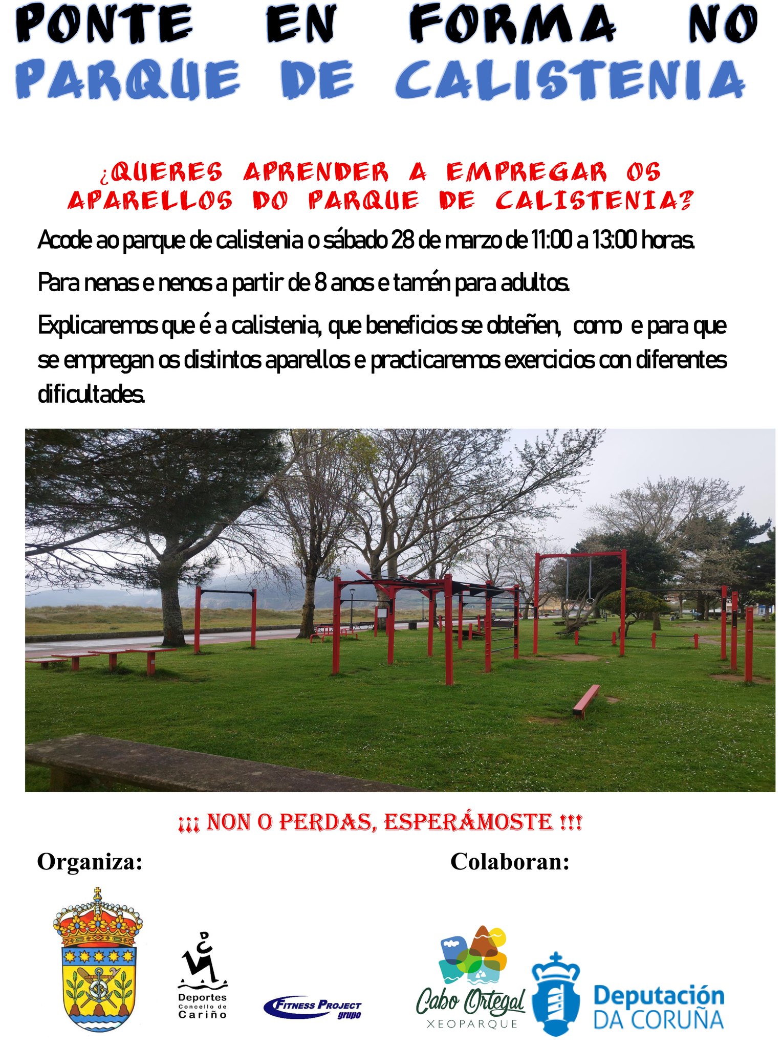 O sábado 28 de marzo de 2026, de 11:00 a 13:00 horas, realizaremos unha actividade no parque de calistenia, na que un monitor explicará que é a calistenia, que beneficios se obteñen, como e para que se empregan os distintos aparellos e practicaremos exercicios con diferentes dificultades.