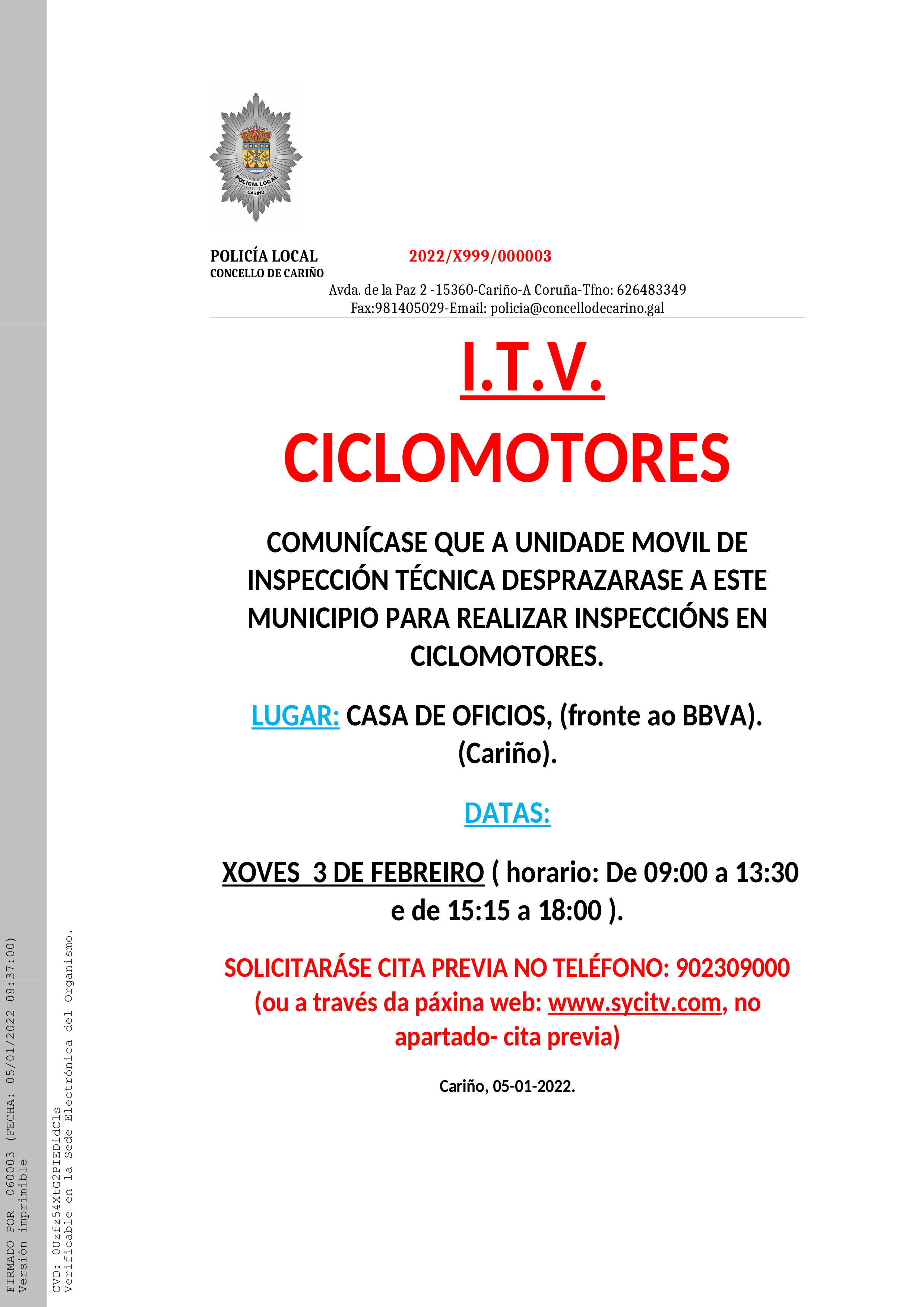 A Unidade de inspección técnica de CICLOMOTORES estará ubicada na CASA DE OFICIOS os seguintes días: