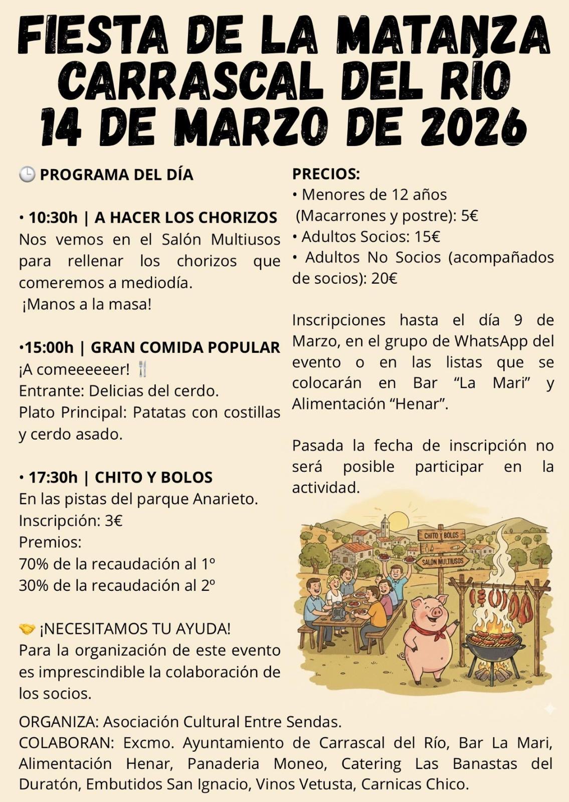 Como siempre, desde el Ayuntamiento queremos agradecer a Los Quintos 2026, a la Peña Madridista de Carrascal del Río, a la Asociación Cultural Entre Sendas y a todos los que colaboran, la puesta en marcha y realización de estas actividades. GRACIAS
