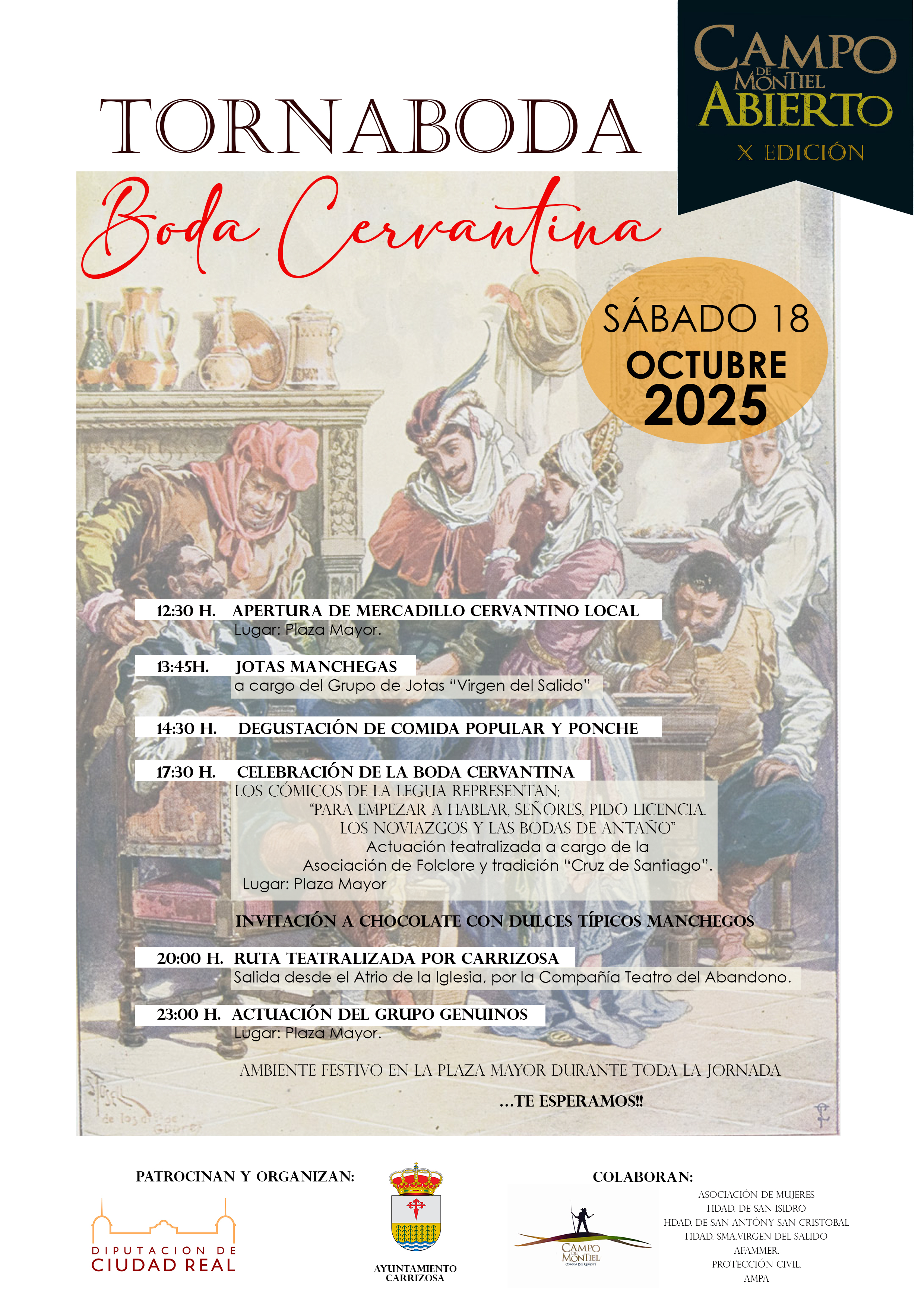 Se informa que el Sábado 18 de Octubre, se celebrará en Carrizosa la Tornaboda. Boda Cervantina, los actos serán los siguientes: