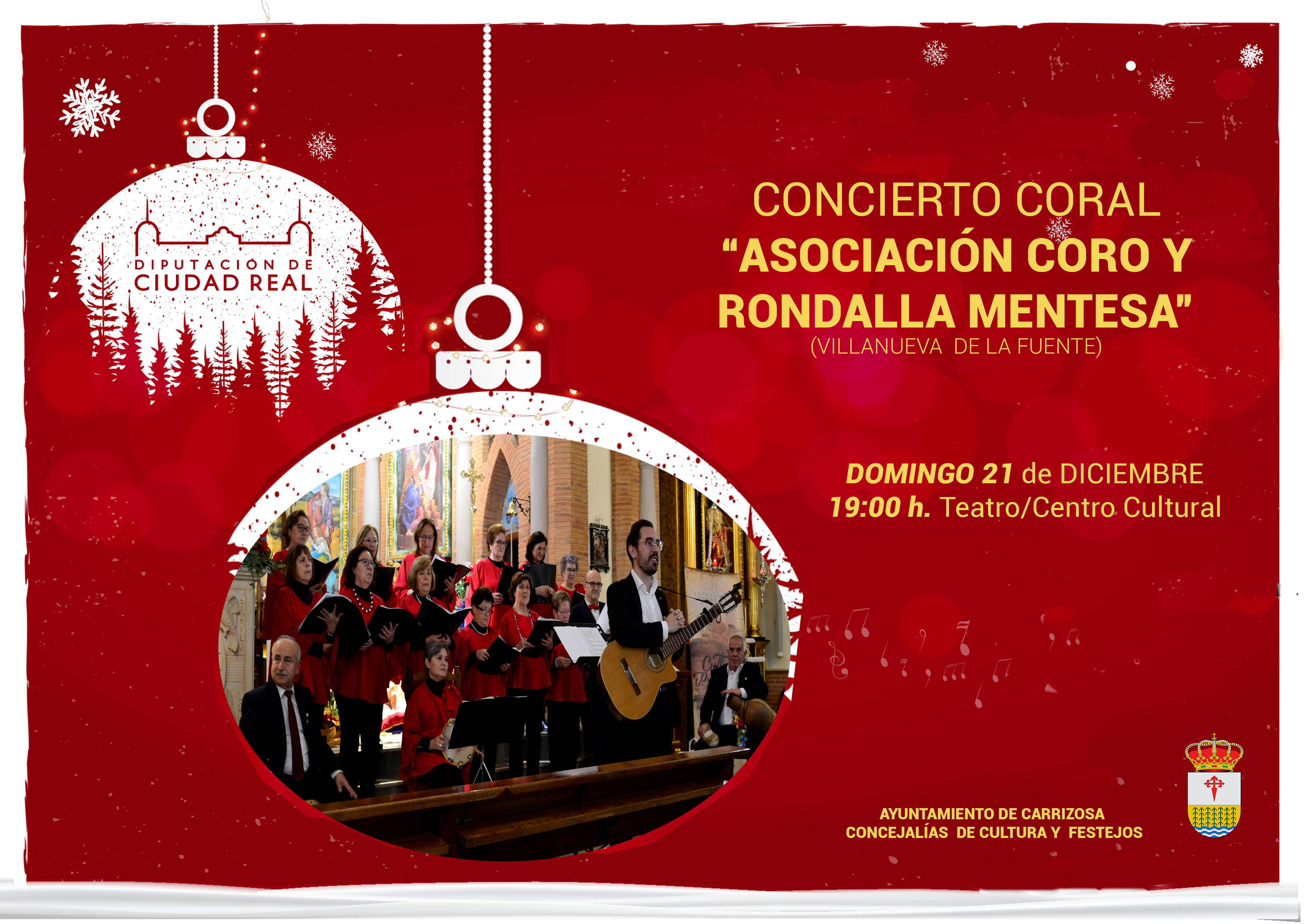 Este Domingo 21 de diciembre, a las 19:00 h horas de la tarde la ASOCIACIÓN CORO Y RONDALLA "MENTESA" realizará en el Teatro / Centro Cultural, una representación de villancicos tradicionales y populares patrocinada por el Ayuntamiento de Carrizosa y con la colaboración de la Diputación de Ciudad Real.