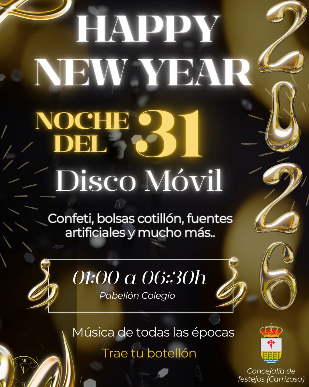 El miércoles 31 de diciembre Ven a celebrar con nosotros la entrada al 2026 en la HAPPY NEW YEAR PARTY que celebraremos en el pabellón del colegio desde las 01:00h hasta las 6:30h.