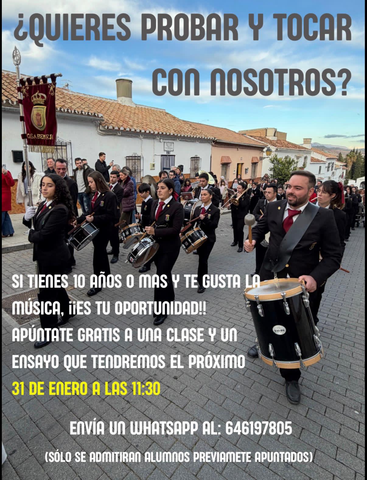 El próximo día 31 de enero de 2026 a las 11:30 tendrán una clase gratuita de música y si puedes o quieres podrás participar en un ensayo para que veas que no es tan complicado.